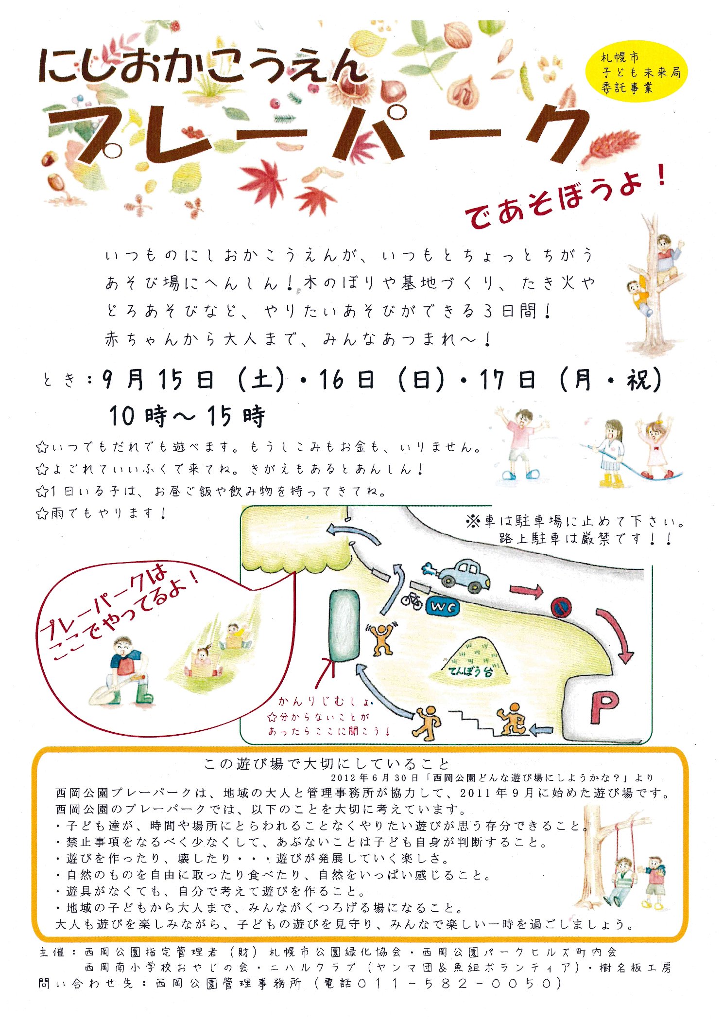今月の15日(土)、16日(日)、17日(月・祝日)の3連休で西岡公園プレーパークを開催します!!!いつもとちょっと違う西岡公園に変身します!10時~15時の間はいつ来ても、いつ帰ってもOK!!子どもから大人まで誰でもやりたい遊びができる3日間となってます。詳しくは上のチラシをご覧ください。