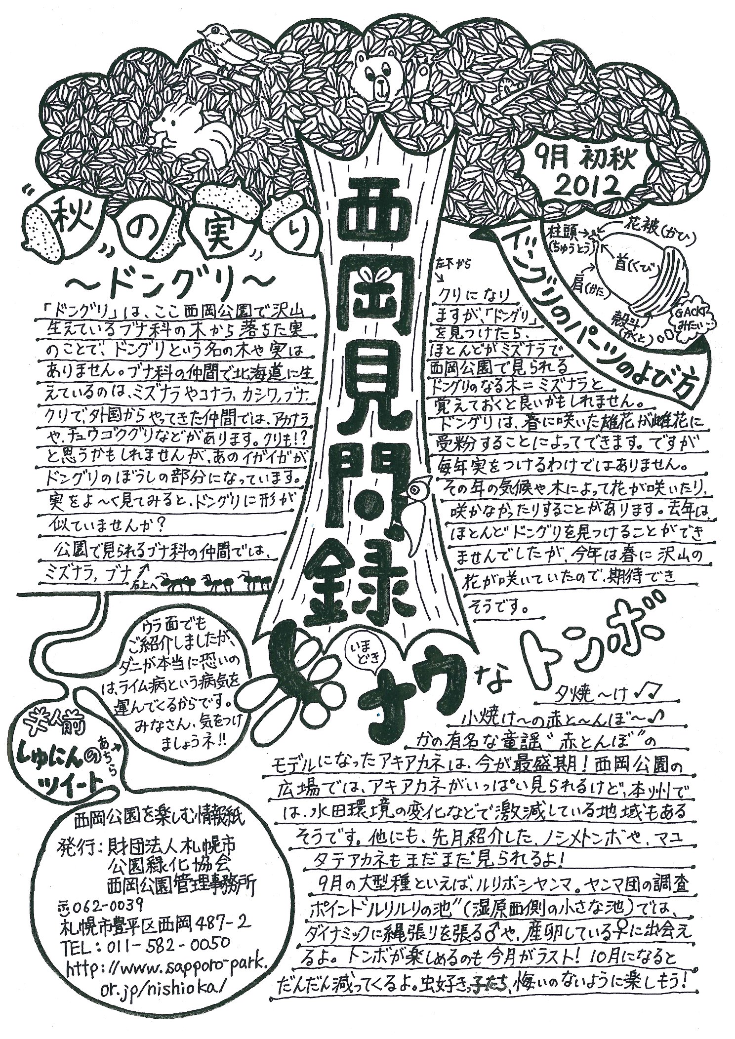 西岡見聞録9月号が出来ました。表紙では「秋の実り~ドングリ」と今月オススメのトンボを紹介している「ナウなトンボ」では 赤トンボを紹介しています。裏面では「いまアツイ!キケンなやつら」では、今後も注意していきたい「スズメバチ」と「マダニ」の話題と今月の見所を紹介しています。