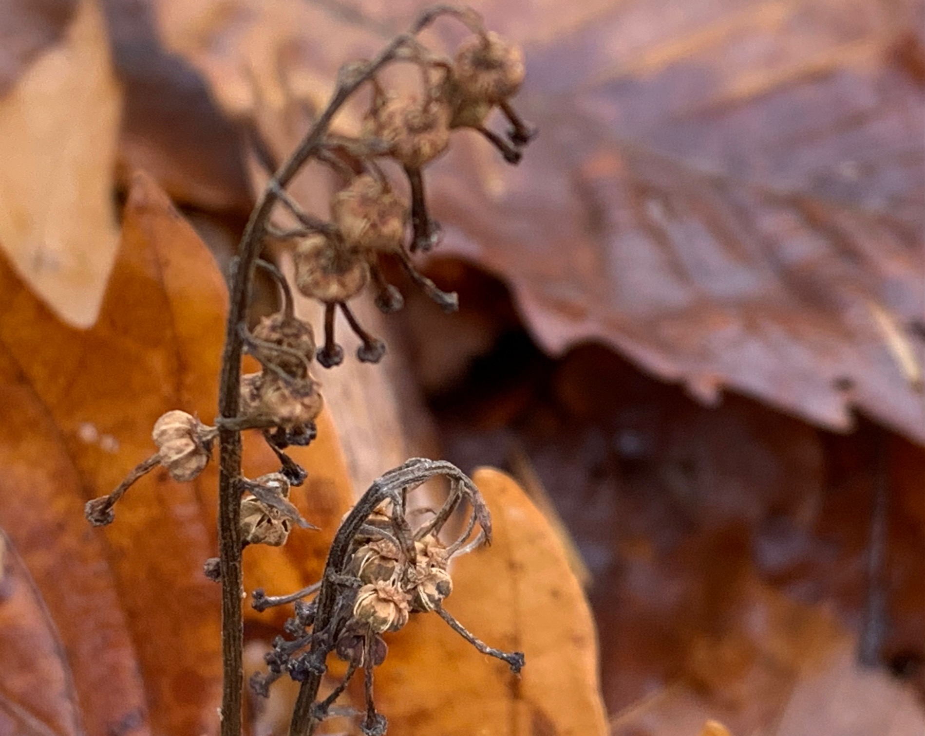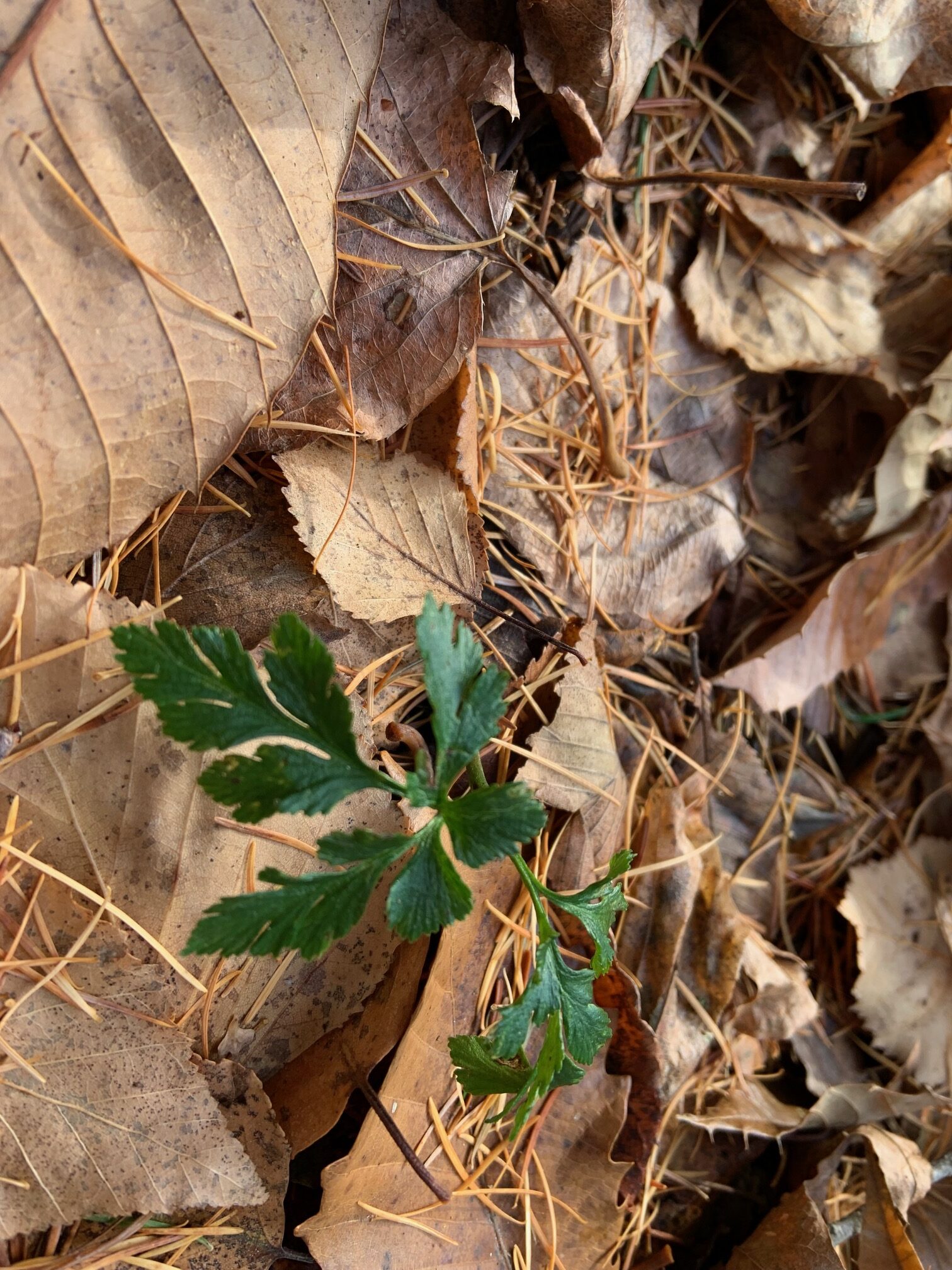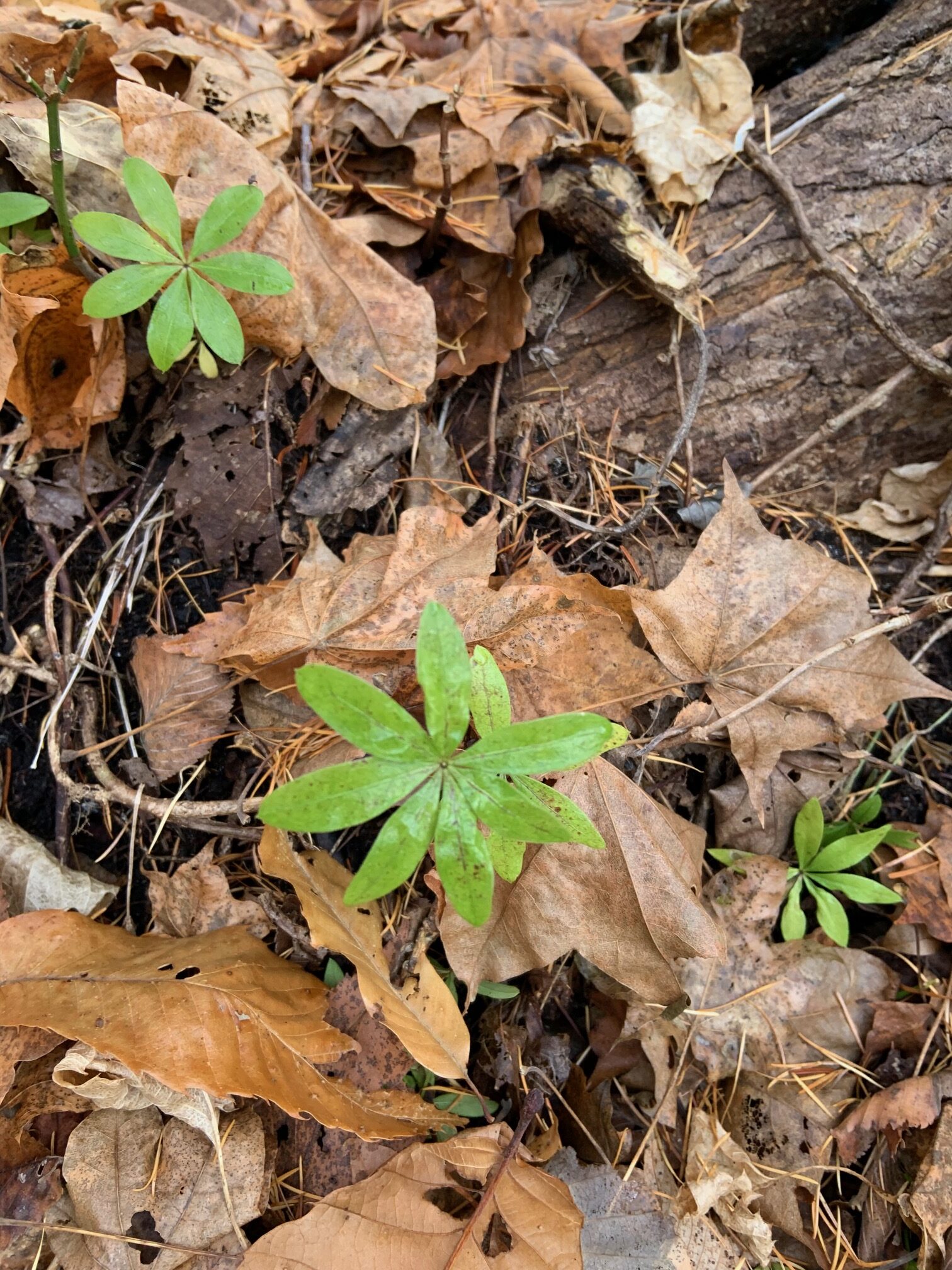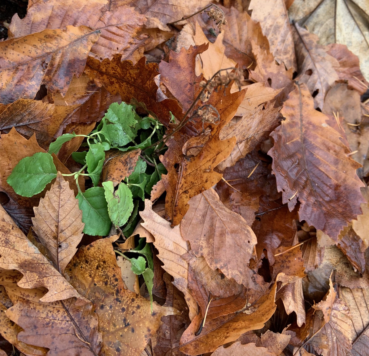 落ち葉の間にコイチヤクソウの緑色の葉を見つけました。