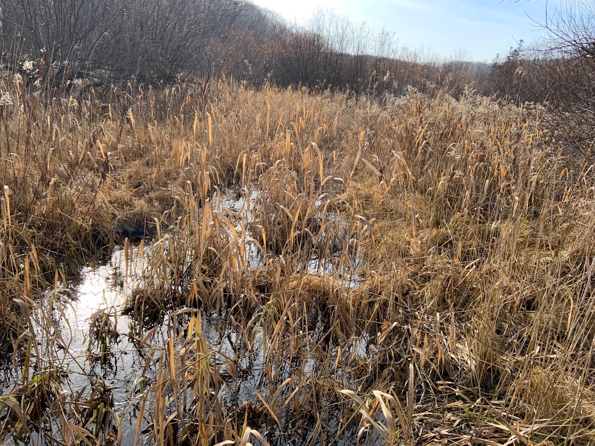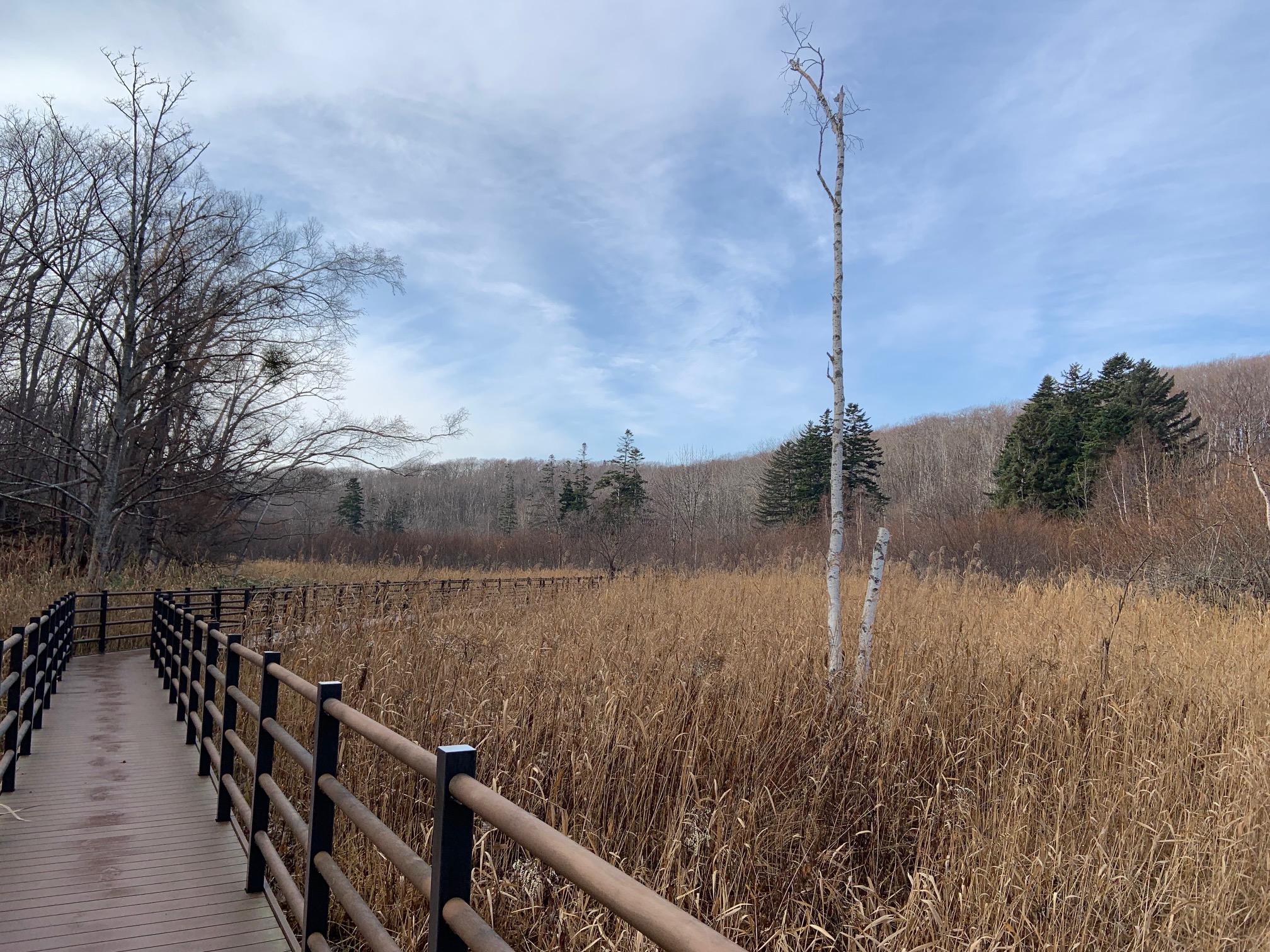 湿原のヨシの穂やオオアワダチソウの綿毛が光に透けるときれいです。