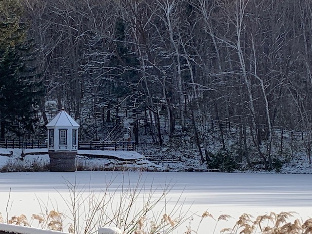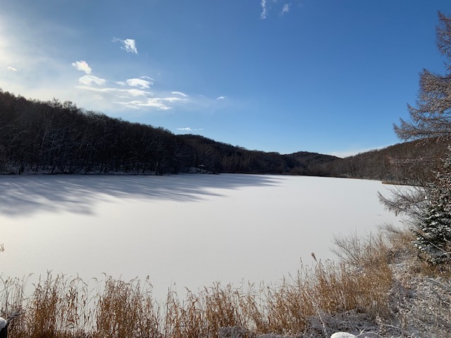 昨日までマガモやカワアイサが泳いでいた池が今朝には真っ白に全面結氷していました。