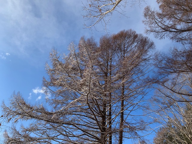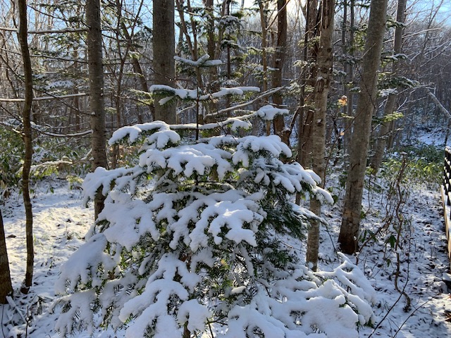 雪をかぶった針葉樹がクリスマスツリーみたいです。
