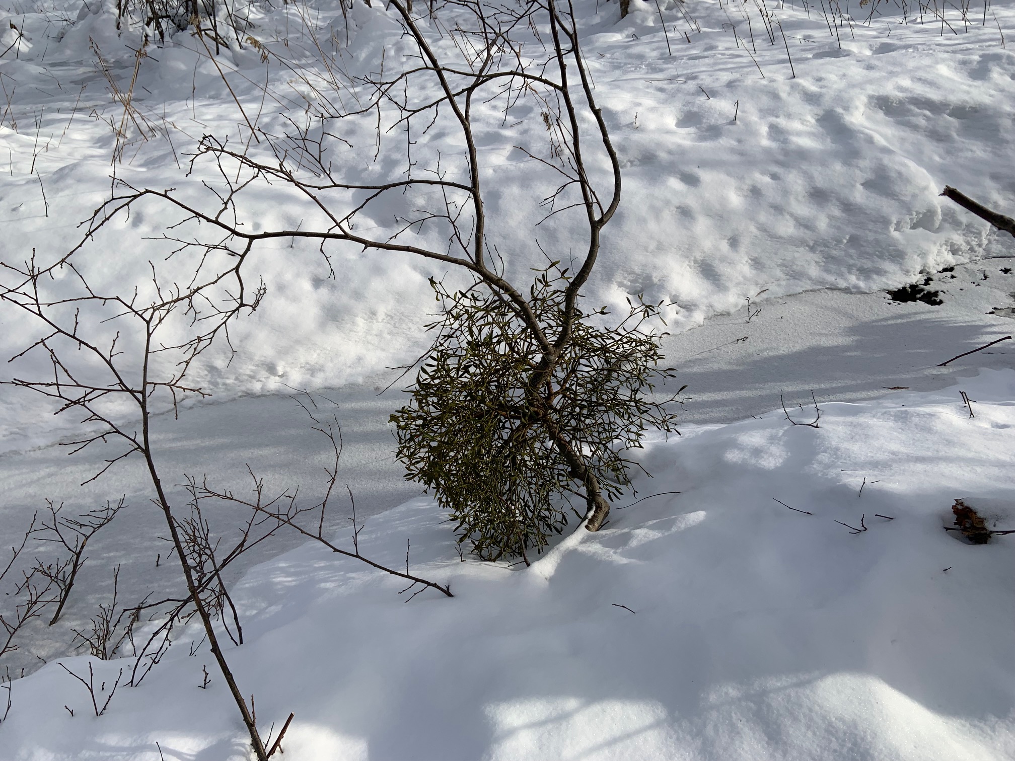 駆けつけると、きれいに形が保たれたヤドリギのついた折れ枝が、雪に突き刺さっていました。