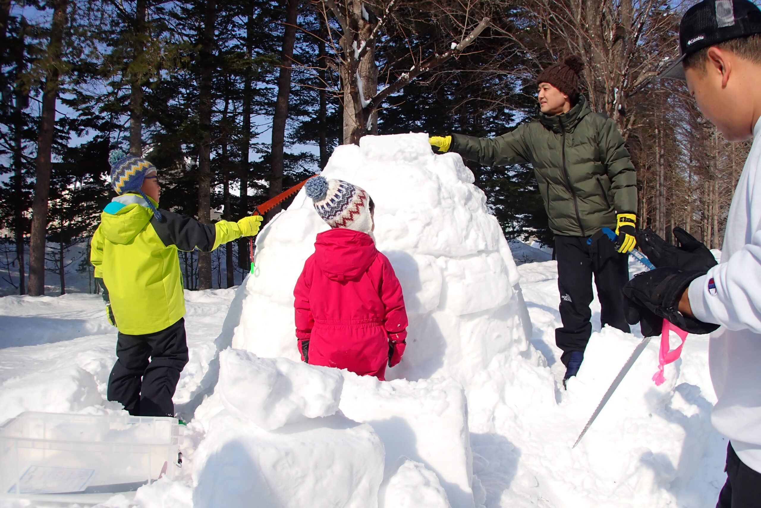 スノーソーという雪用ののこぎりで、雪を切り出してブロック状にしたものを積んでいきます。