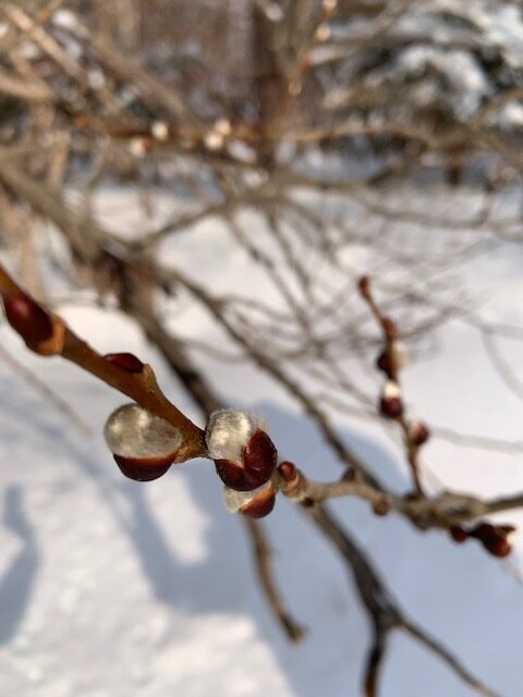 ヤナギの花芽がやわらかい銀白色の毛に覆われています。