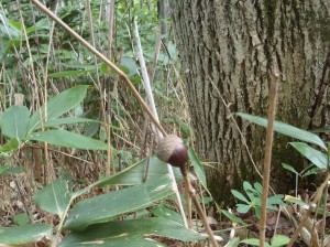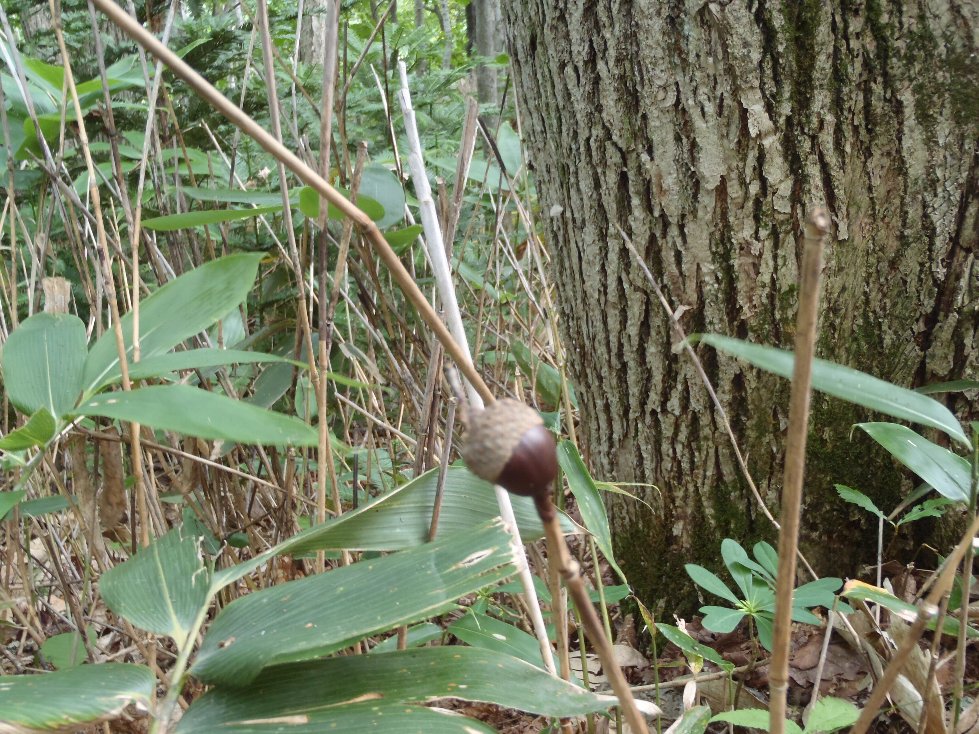 写真ではわかりにくいかもしれませんが、実は枯れた笹にどんぐりが刺さっていました。偶然なのか?誰かがいたずらして刺したのか?まるでモズのはやにえの様なミステリーでした。