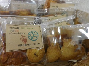 このビスケットは、今だけ!西岡公園限定で販売しています。大袋が300円、小袋が100円です。