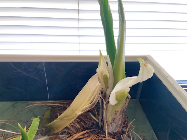 この白い仏炎苞は花びらではなく葉が変化したものですよ。