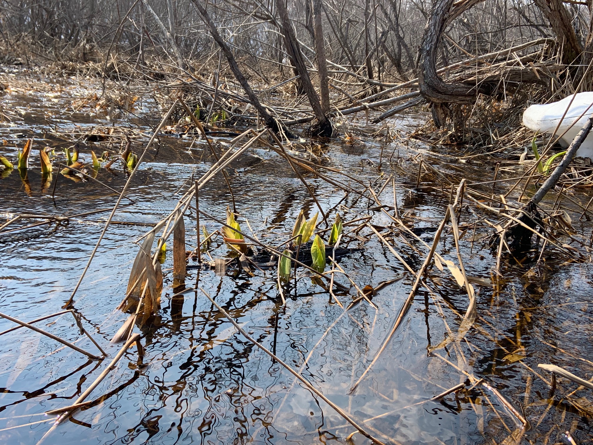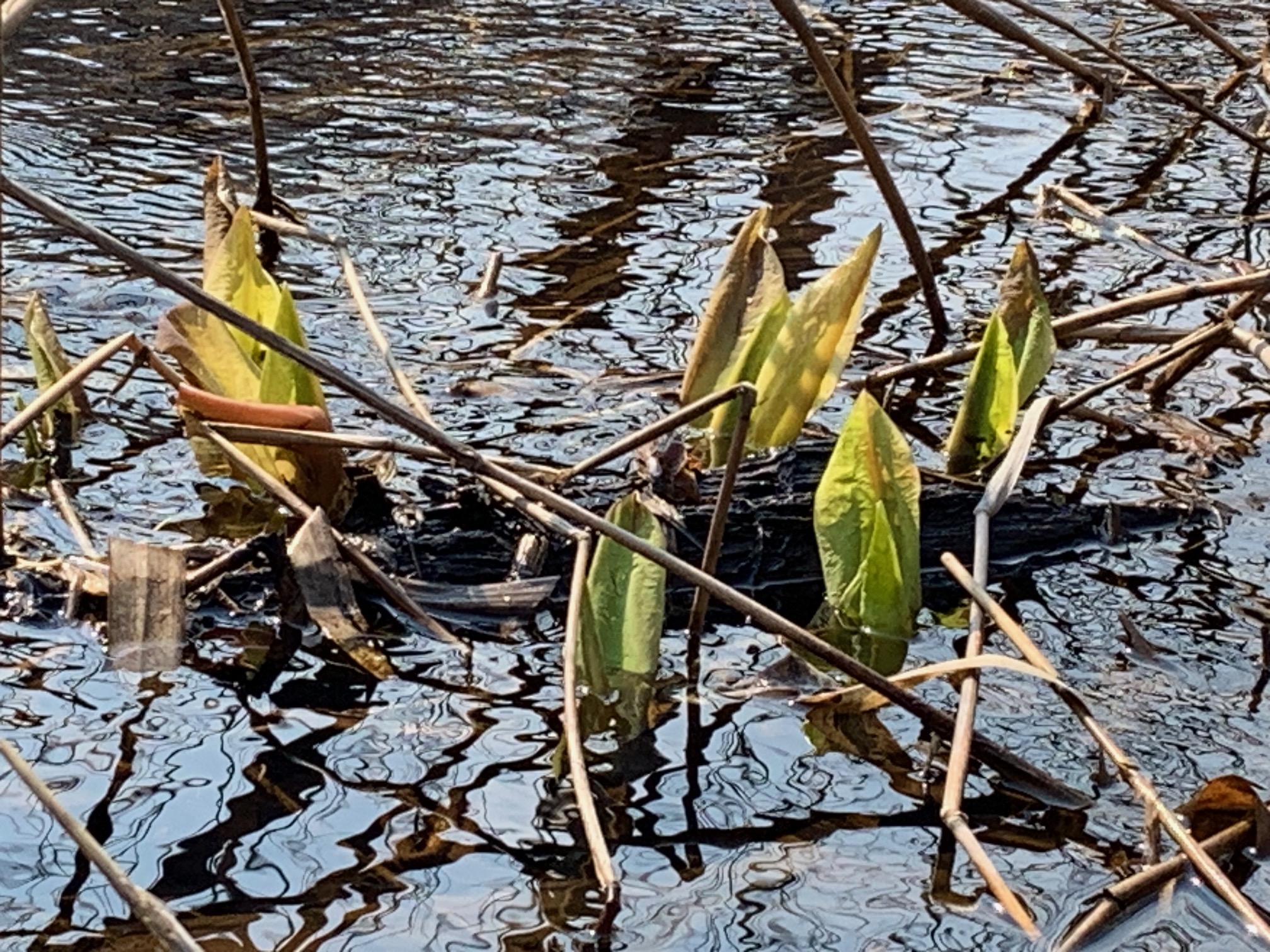 雪どけとともに水面に顔を出しているミズバショウの芽を見つけましたよ。