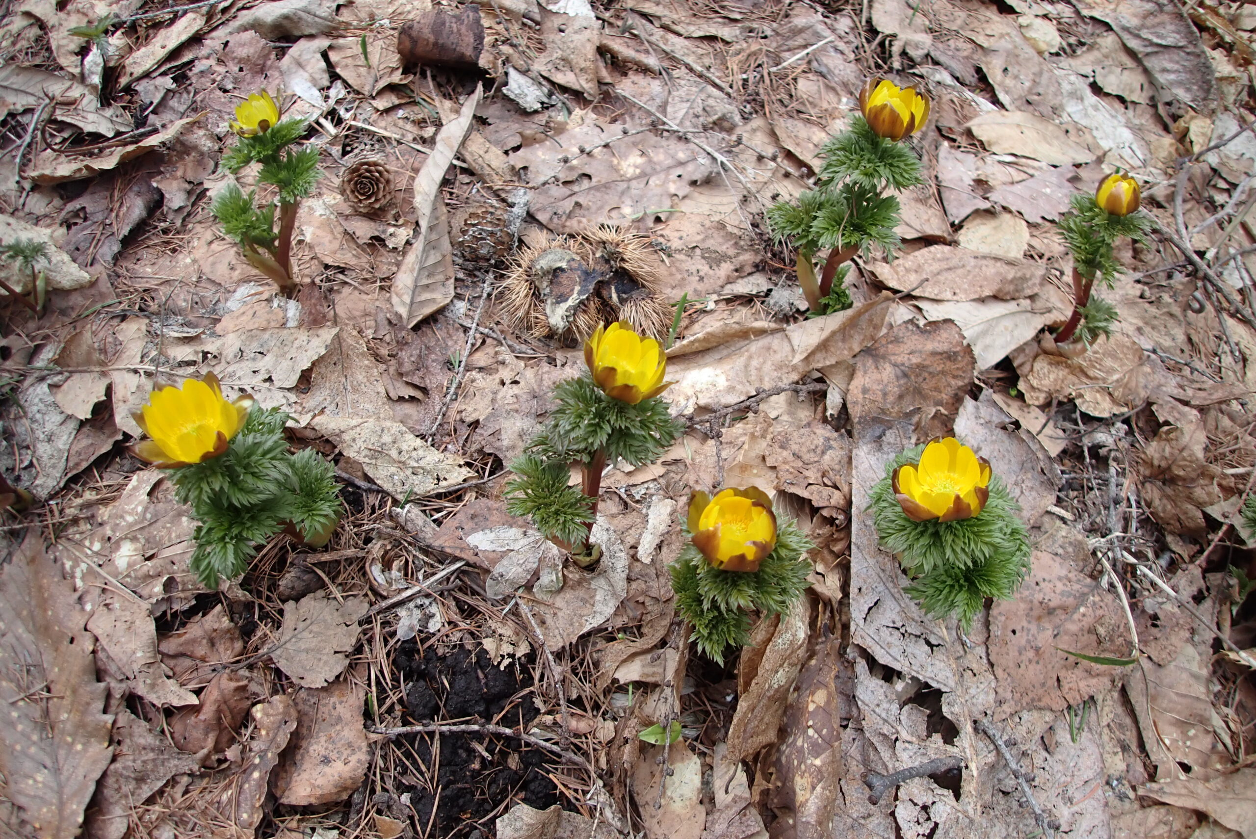 森の中の園路沿いにはナニワズの黄色い花が咲いていました。