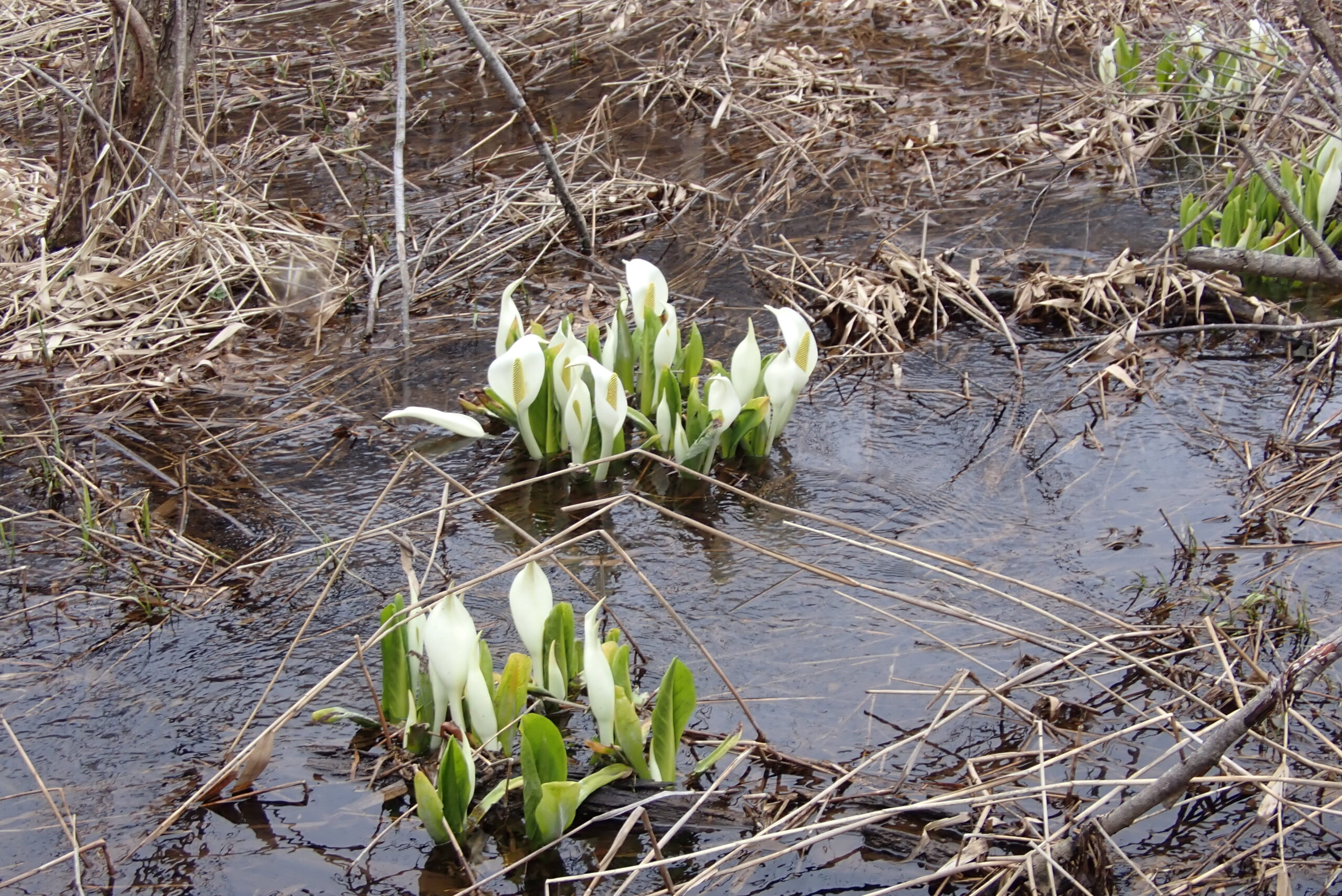 西岡公園の春の湿原はミズバショウが見頃を迎えました。