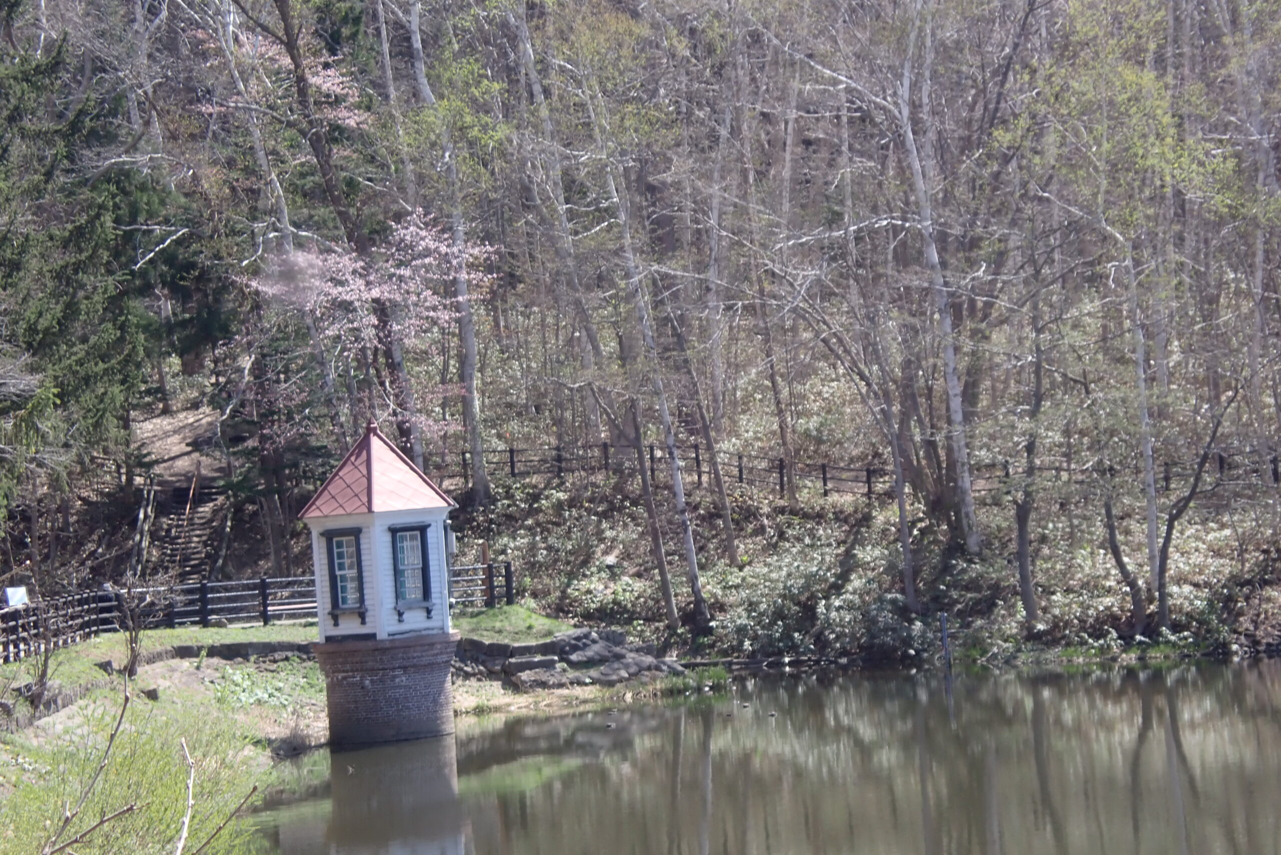 池のほとりの取水塔の背景がエゾヤマザクラの桃色になっています。