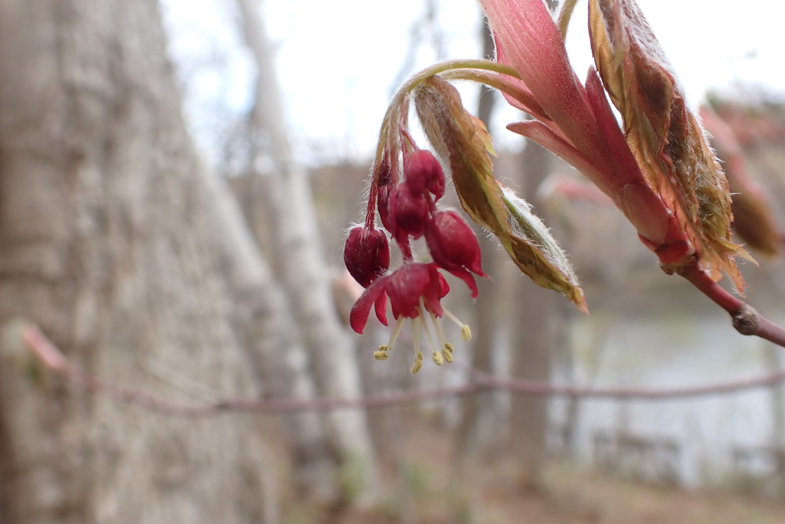 ハウチワカエデの赤い花が枝先にぶら下がっています。