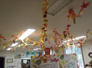 チラシラックの上に秋をイメージした飾りがずらっと並んでいます。