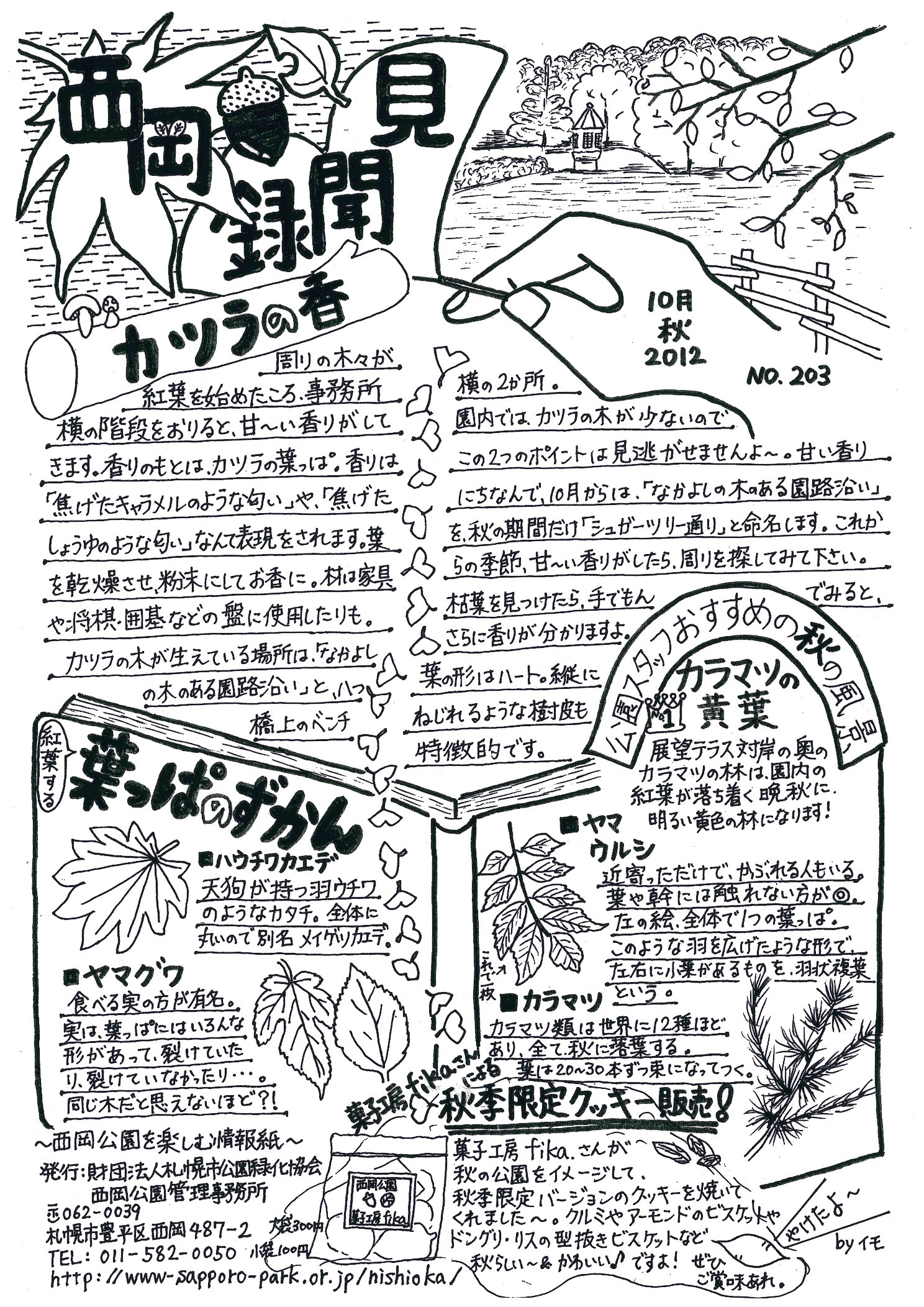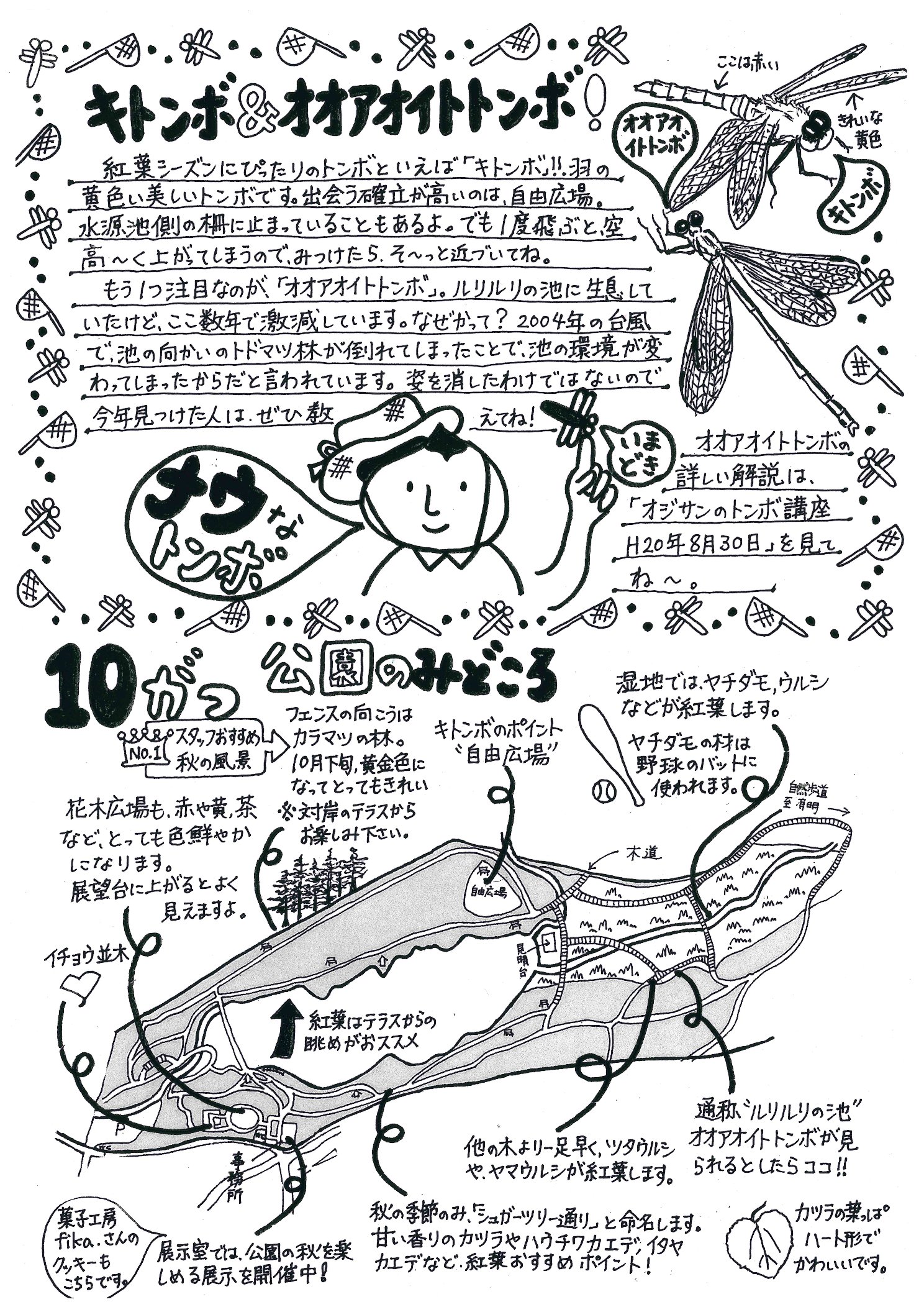 10月の西岡見聞録では秋になると甘~い香りを出す「カツラ」のお話と「紅葉する葉っぱ」の図鑑を表面に記載、裏面では10月に見られる最後のトンボに、この季節の見所を紹介を紹介しています。