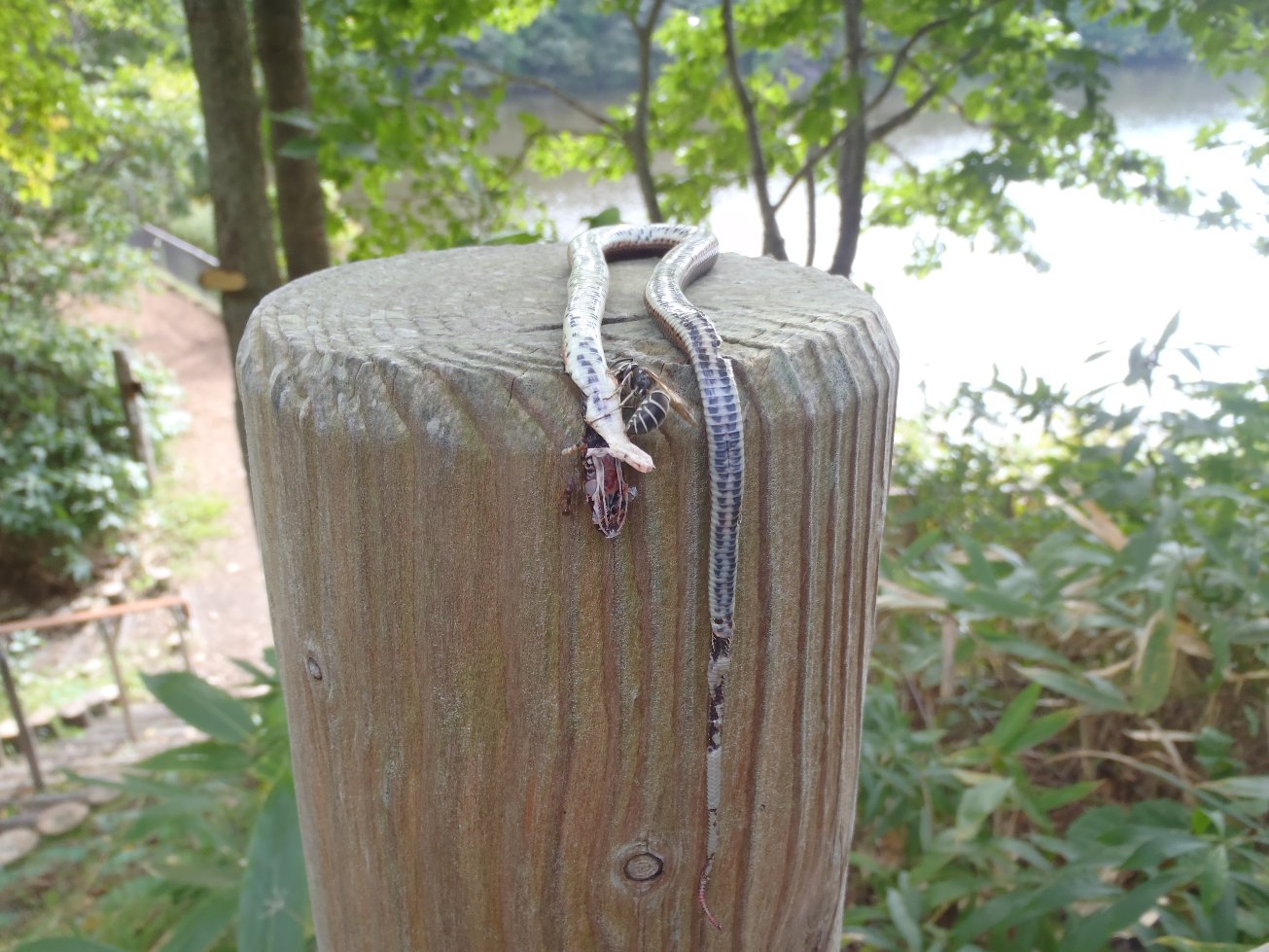 一昨日の魚組調査で、ビックリな光景に出会いました。 小さなジムグリの死骸にクロスズメバチが群がっていたのです。 クロスズメバチは肉食のハチ。トンボやクモを捕まえる光景には出会ったことが ありますが、ヘビを食べているのは初めて見ました。 魚組の子ども達もビックリ!なかなか見られないものを見ることができました。