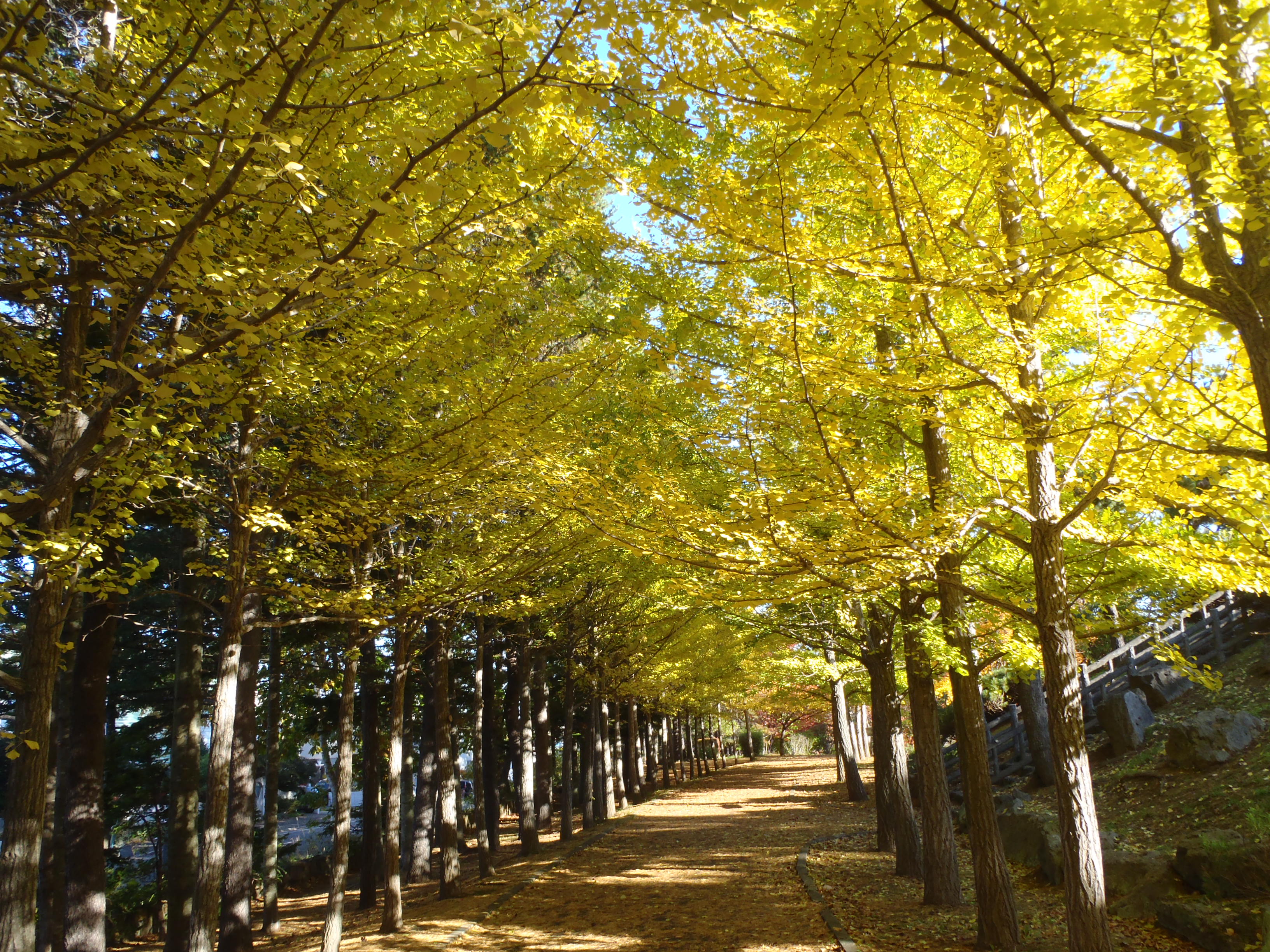 周りから少し遅れ気味だったイチョウも色づいてきて、黄色いトンネルとなりました。まだ完全に黄色にはなっていませんが、全部が黄色にそまるととてもキレイですよ。