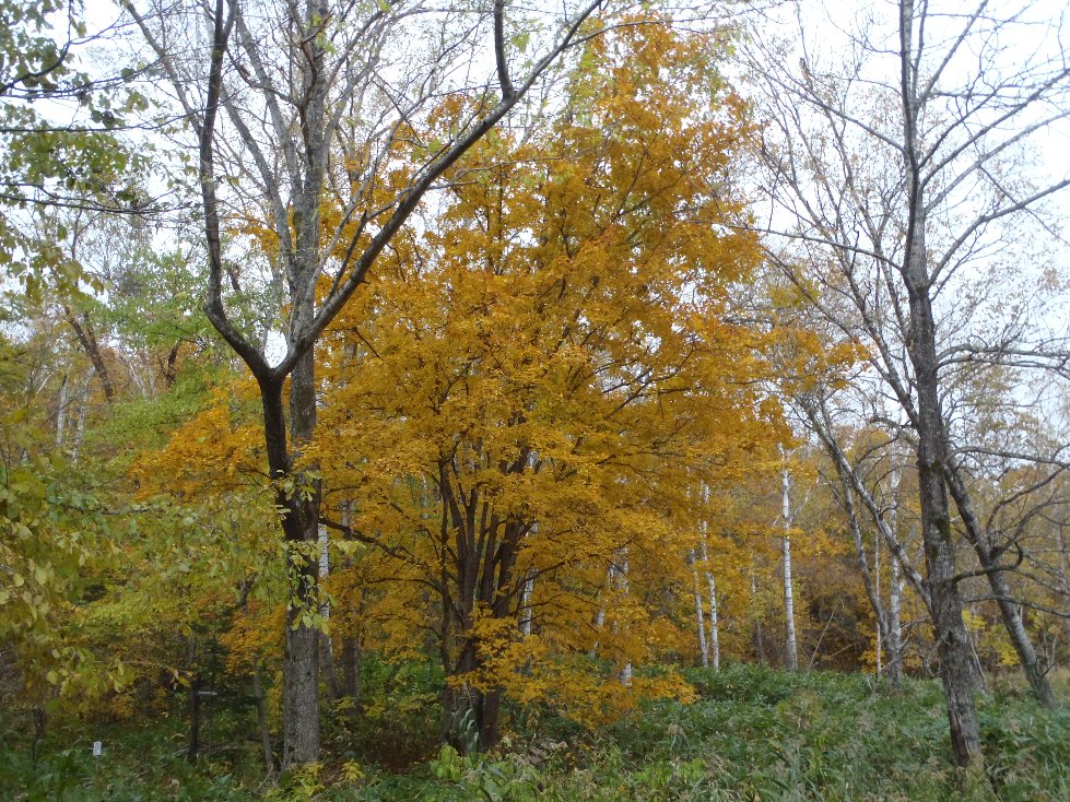 芝生広場から入って木道見晴台へ行く途中のイタヤカエデがキレイに黄葉していましたよ~。