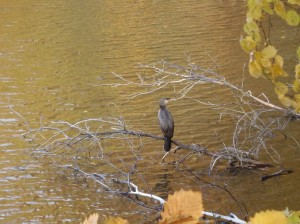 マカモを見ながら池の周りをグルッと回っていると、倒れた木の上にちょこんと座っているウミウを発見。双眼鏡でじっくりと観察していると、右を向いたり、左を向いたり、キョロキョロと落ち着かない様子でした。池の反対側に回ってもう一度見ようとしたら、すでにその場所にウミウの姿はありませんでした。
