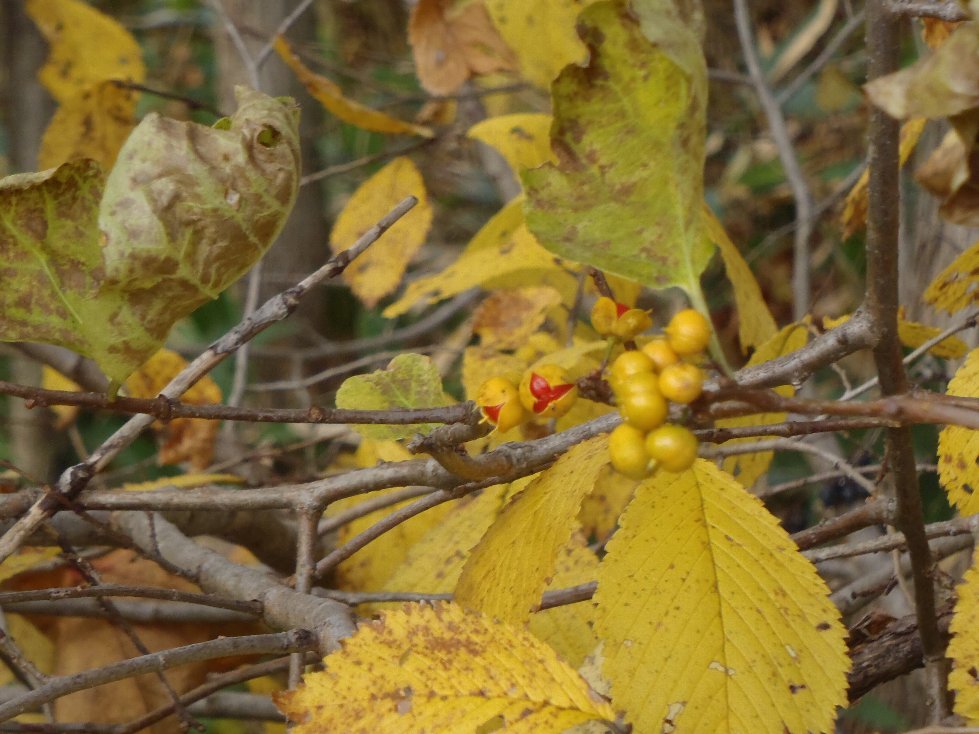 自由広場のツルウメモドキが黄色く色づき、先が割れ始めていました。今の所少ししか割れていませんが、これが割れたら中からキレイな赤い種子が出てきます。よかったら探して見てくださいね。