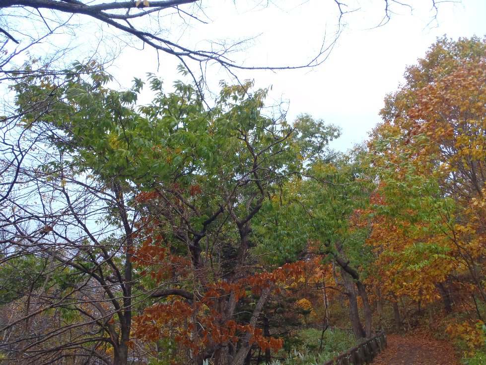 花木広場から駐車場に向かう途中の道にあるクリの樹は、木の実は全部落ちたようですが、葉っぱの大半がまだ緑色をしていました。今年の黄葉はパラパラと色がついているので、紅葉が楽しめる樹が探したらあるかもしれません。
