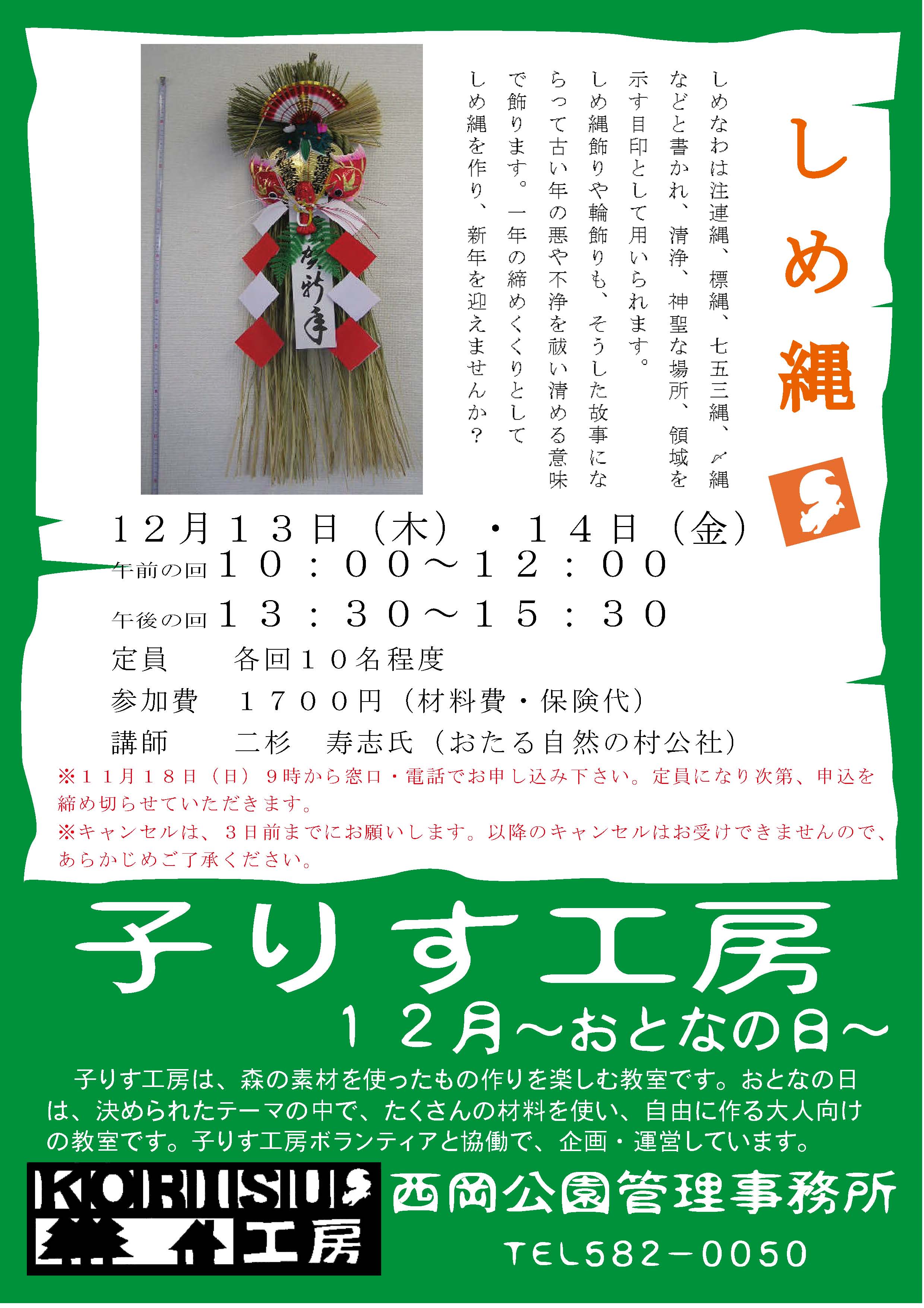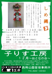 12月の子りす工房は、おとなの日には日本古来のしめ縄づくりを行います。 こどもの日には、おめでたいものをたくさん飾ったお正月用のリースづくりを行います。 お申し込みは、電話や窓口で11月18日より受付いたします。 皆様のご参加をお待ちしています!