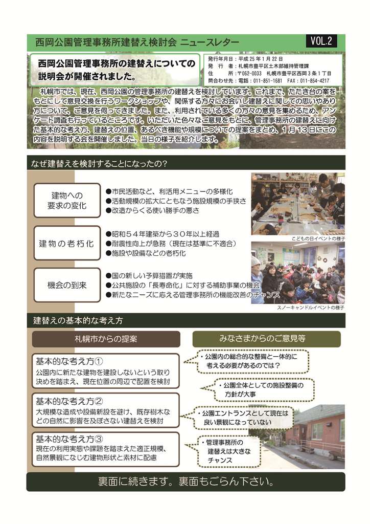 1月13日に実施した「管理事務所建て替え検討会」のニュースレターが完成しました。 このニュースレターは管理事務所でも配布しています。