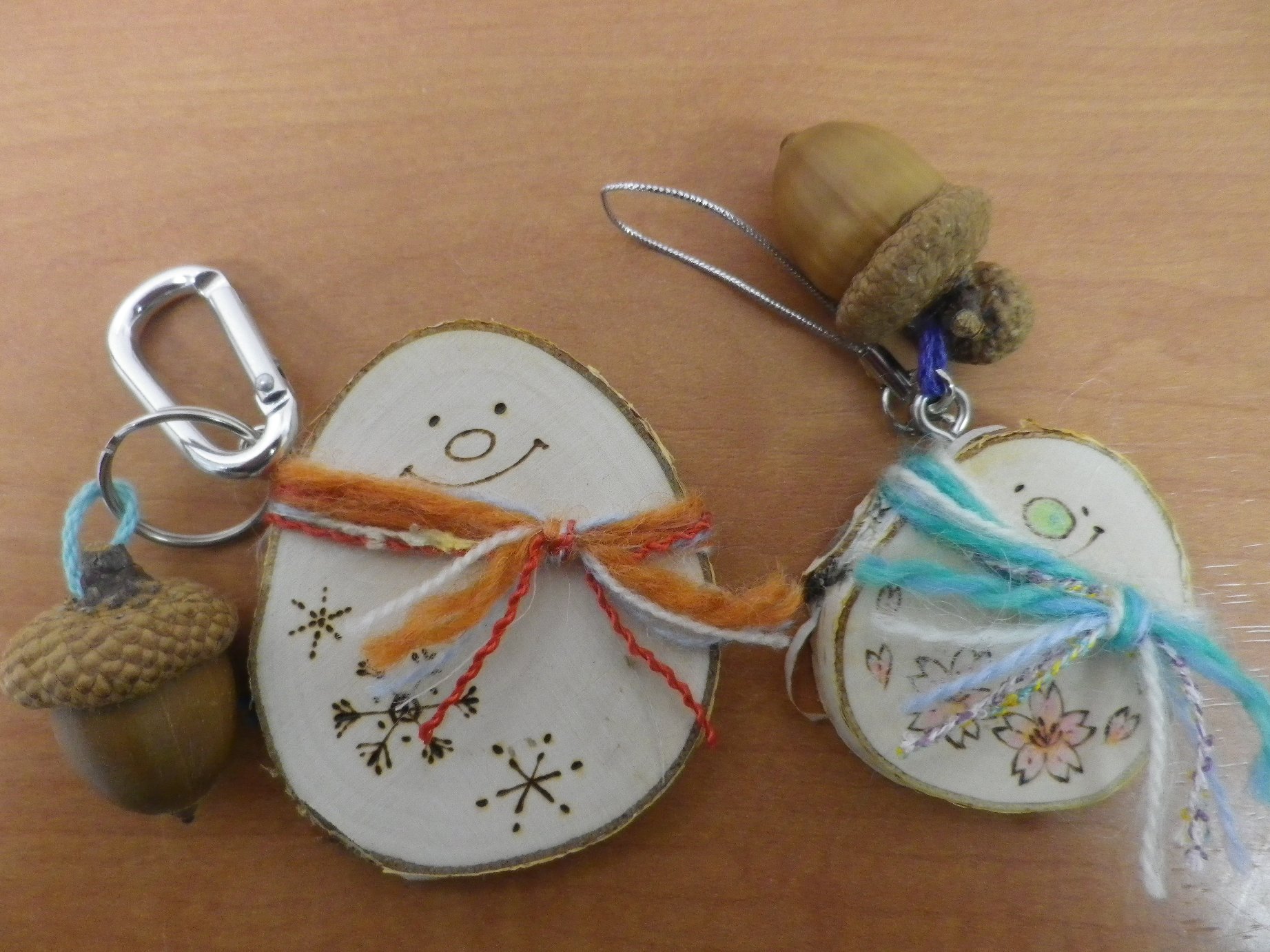 ↑上の写真は、シラカバの板を使った「雪だるまストラップ」(1こ300円)。