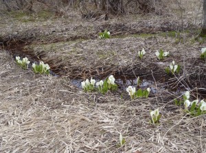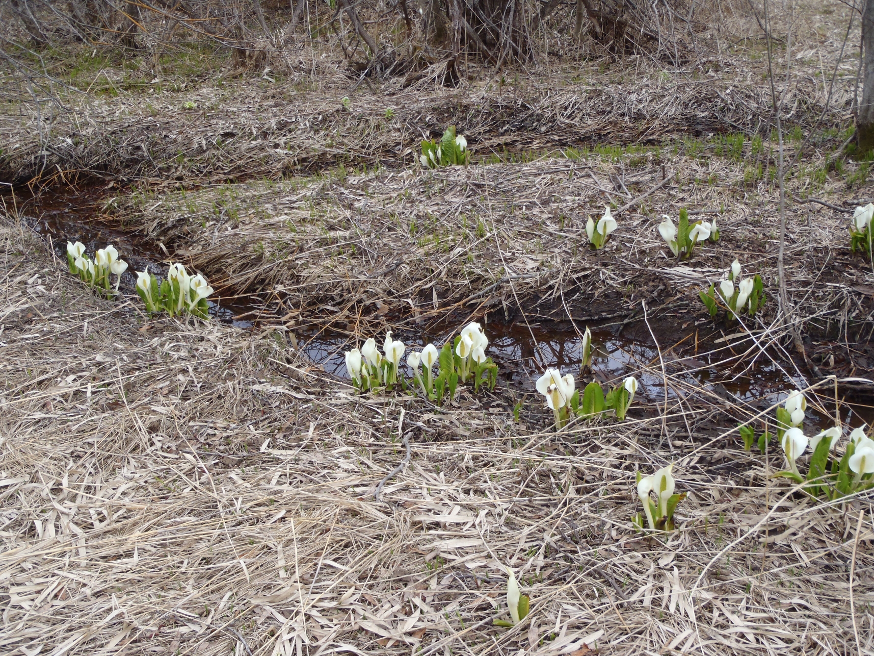 ぐずついた天気が続いていますが、ミズバショウは着々と 成長し、見頃を迎えています。 写真は、今のミズバショウの様子です。ちょうど今が見頃 のようです。今週末からの連休は、是非西岡公園にミズバショウ を見に来てください。皆様のお越しをお待ちしています。