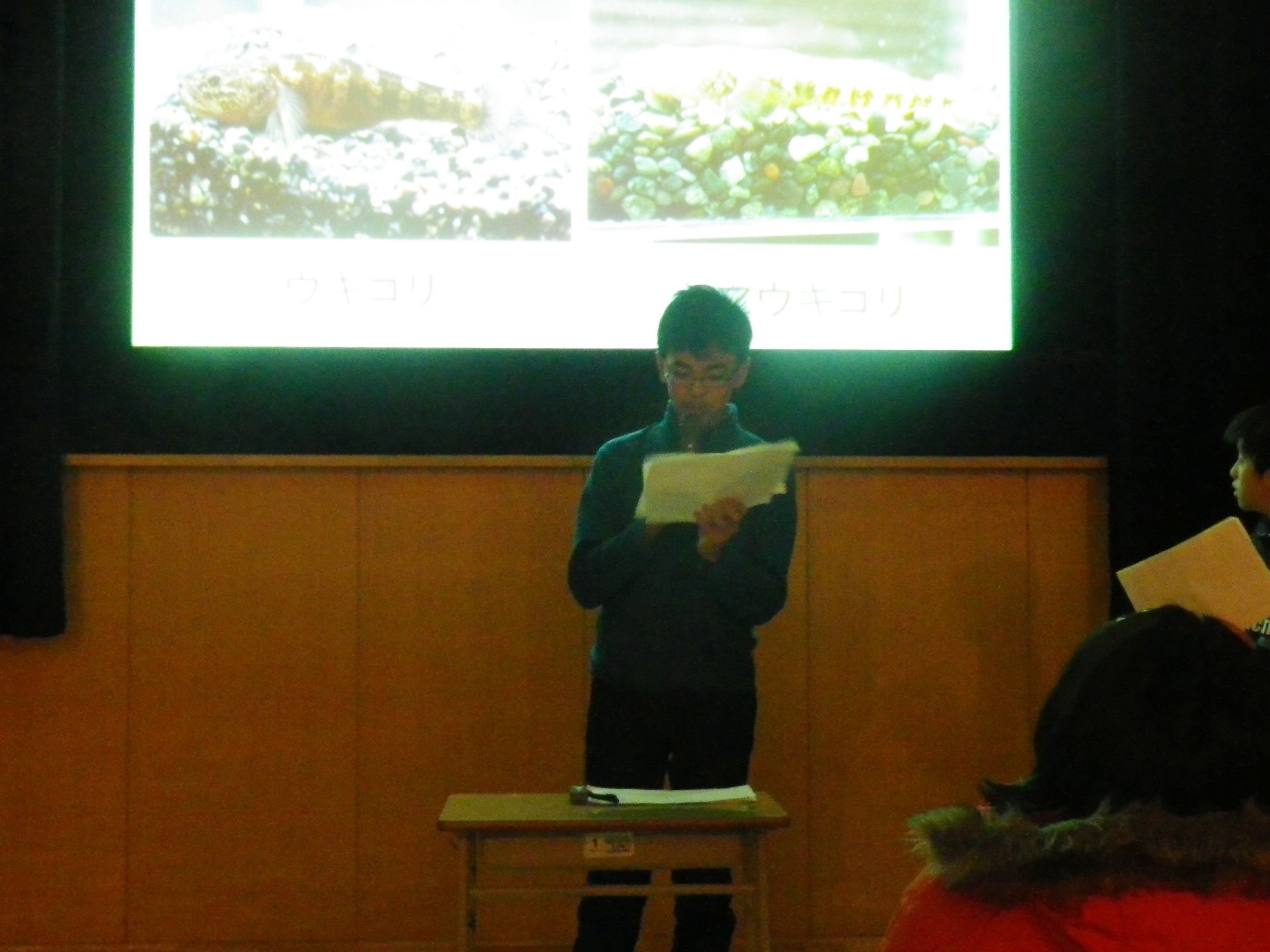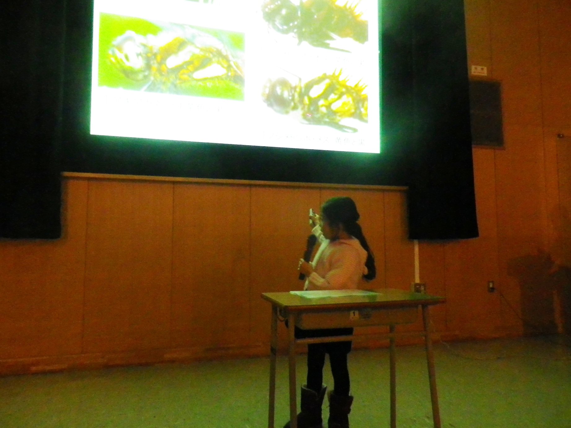 まずは魚組の発表です。両生類調査、水源池調査、水生昆虫調査など、今年の調査で分かったことを発表する子もいれば、トウヨシノボリやスジエビなど、興味をもった生き物について調べて発表する子もいました。