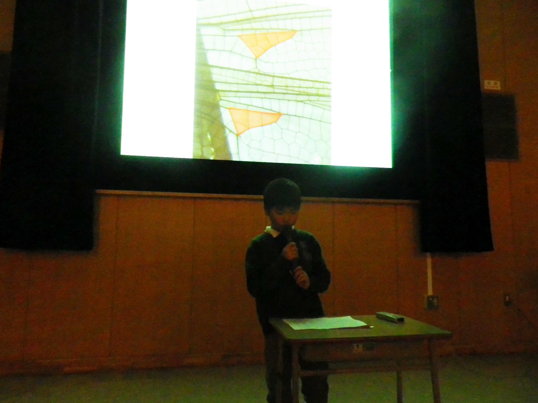 続いてヤンマ団の発表です。ヤンマ団は、アキアカネやニホンカワトンボなど種類にしぼって調べた発表から、「トンボの複眼について」「羽の帯について」など形態に関すること、「飛行スピードの違い」「雄と雌の行動の違い」など行動に関することなど、発表テーマも様々でした。