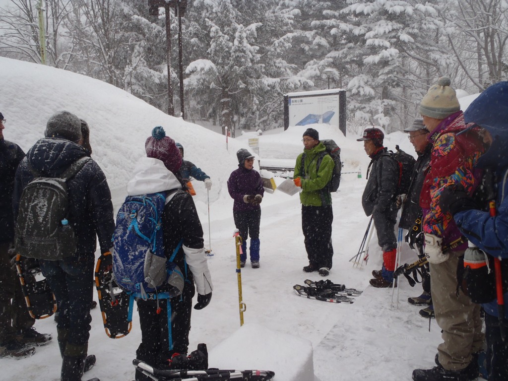 今日は朝から雪が降る中、かんじきウォークが始まりました。