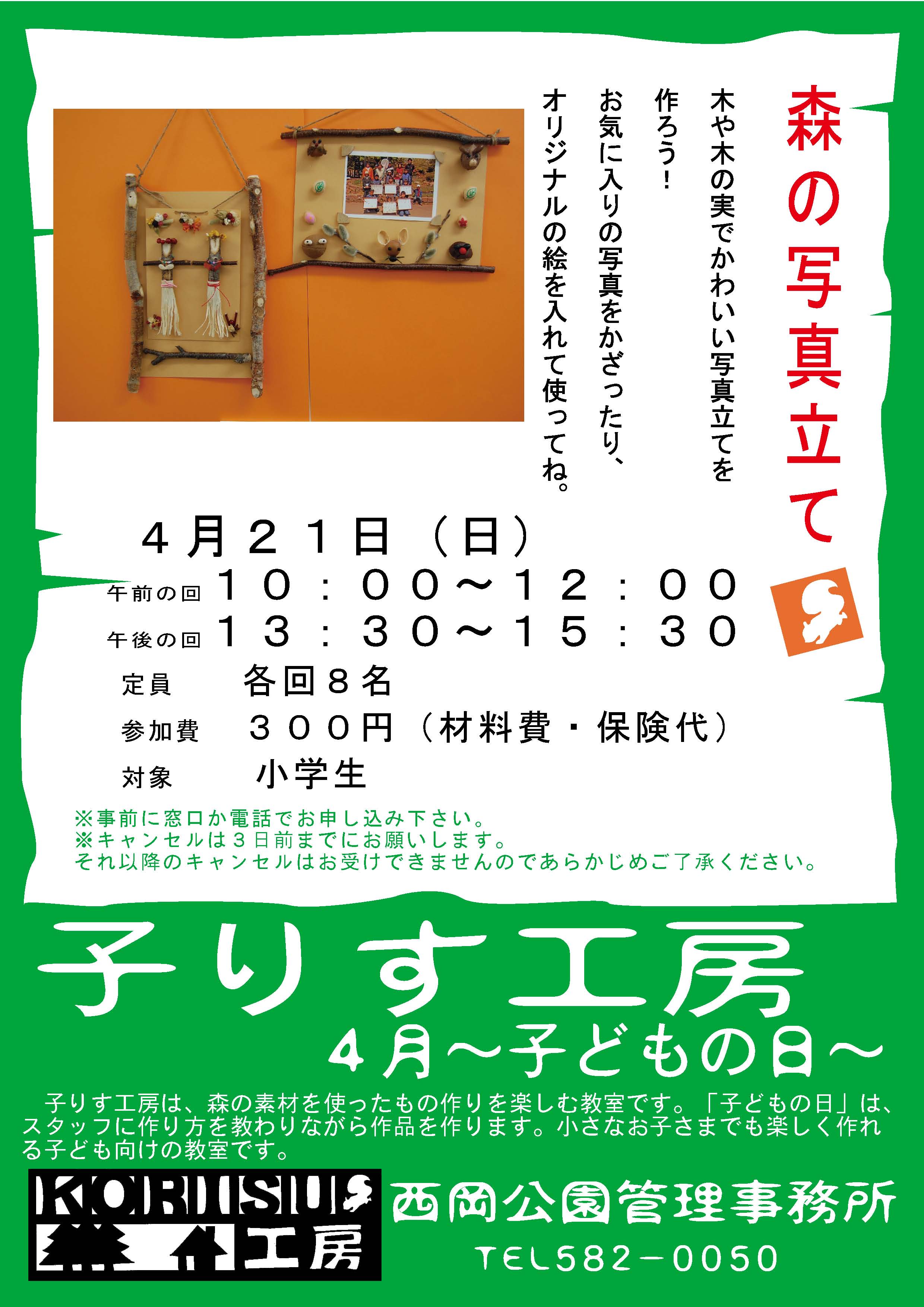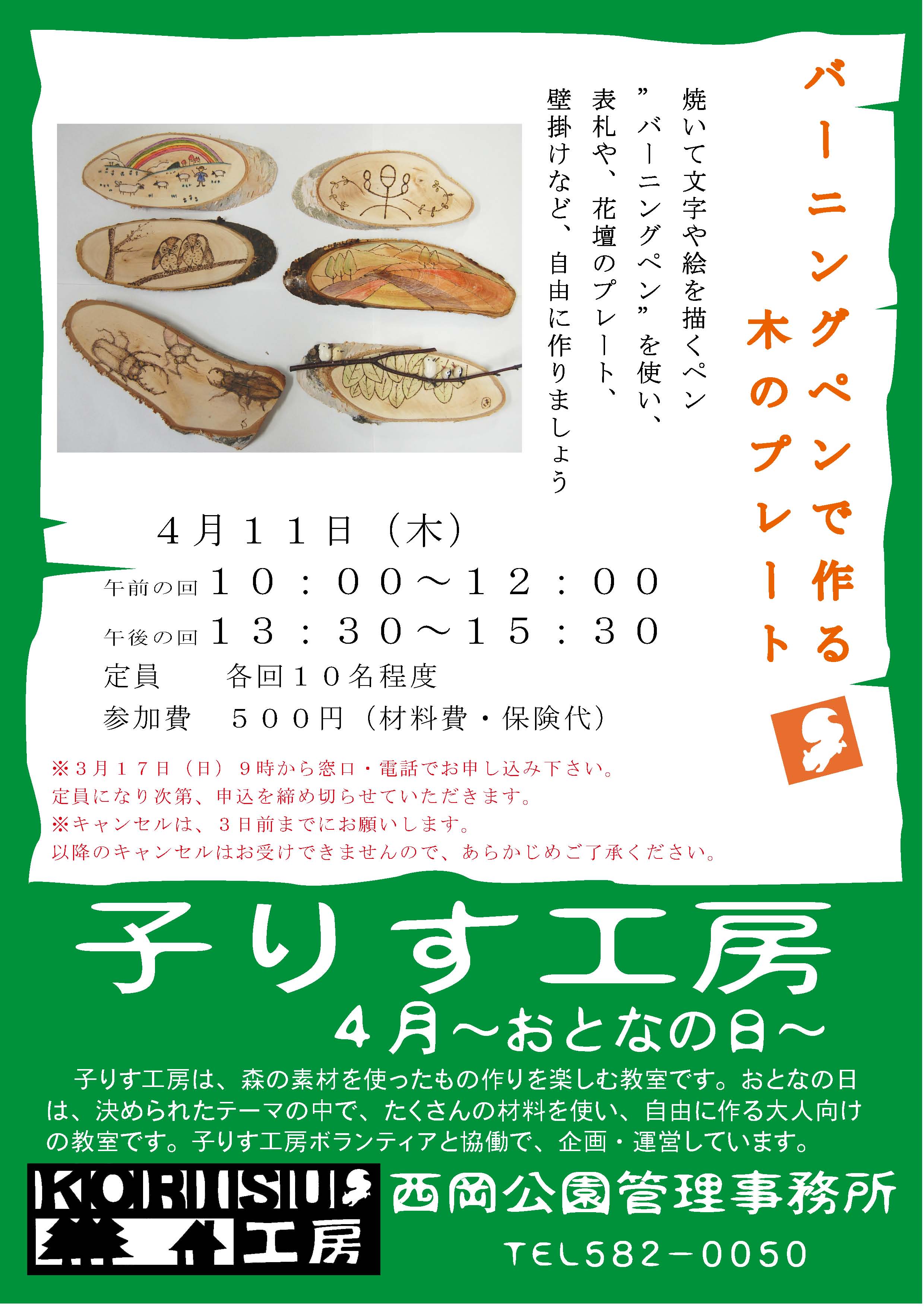 4月の子りす工房は、おとなの日にバーニングペンで木のプレートを作ります。 子どもの日は、小枝や木の実で写真立てを作ります。 申し込みは今日から、開始します。