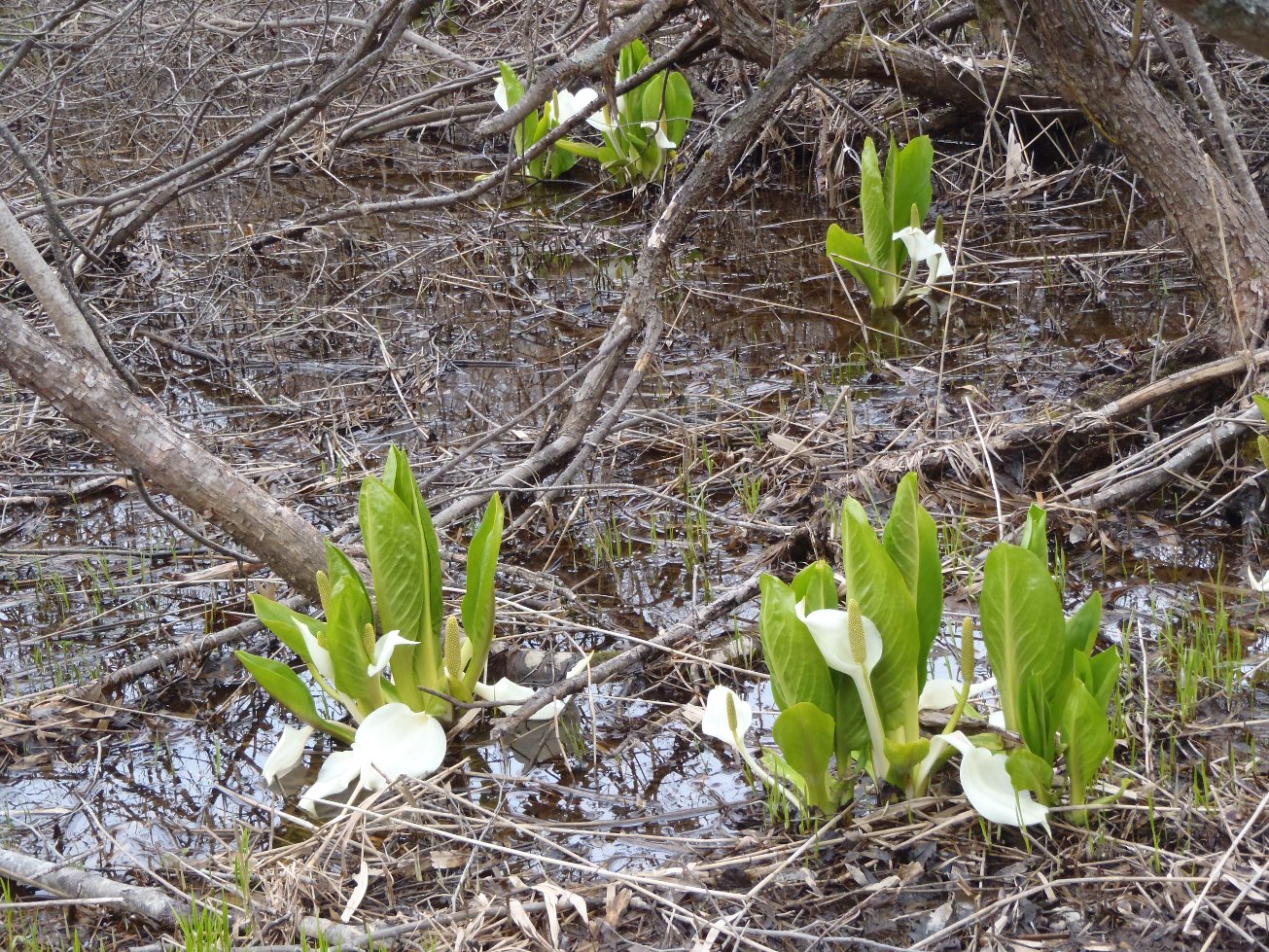 場所によって成長も様々なので、まだ小さいミズバショウもありますが、 写真の様に葉が大きくなってきているものもあります。