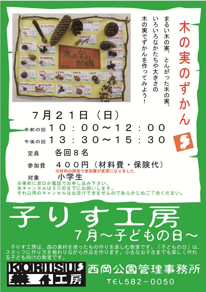 7月の子りす工房~こどもの日は、森でとれるいろいろな 木の実をつかって、大きな図鑑(A2サイズ)を作ります。 夏休みの自由研究にも最適です! 参加ご希望の方は、西岡公園管理事務所(011-582-0050)まで お申し込みください。 皆様のご参加をお待ちしています。