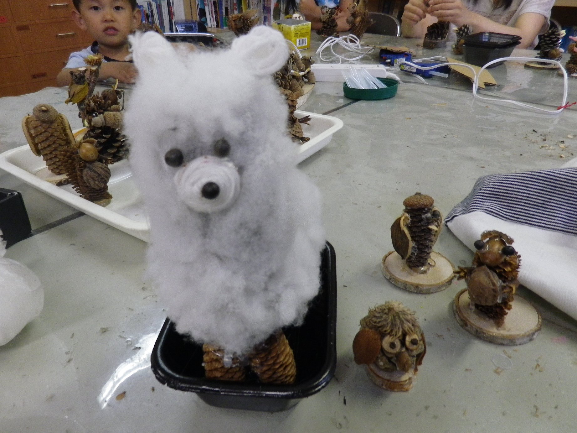 今日は、子りす工房~こどもの日で、いろいろな木の実を使って自由に動物を作りました。
