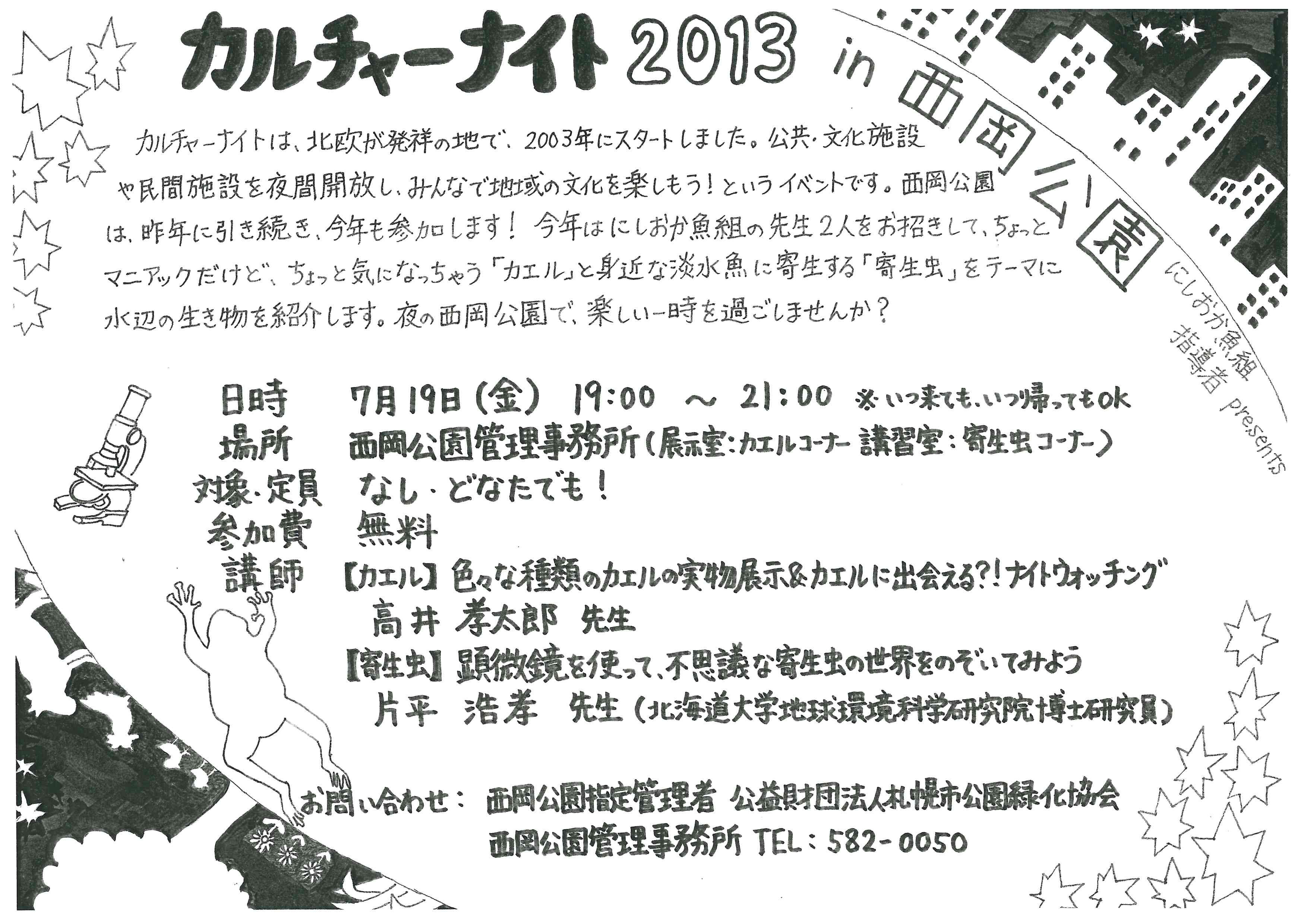 いよいよ明後日はカルチャーナイトです! 今年は、にしおか魚組の先生2人をお招きして、「カエル」や淡水魚に寄生する「寄生虫」をテーマにした水辺の生物を紹介します。