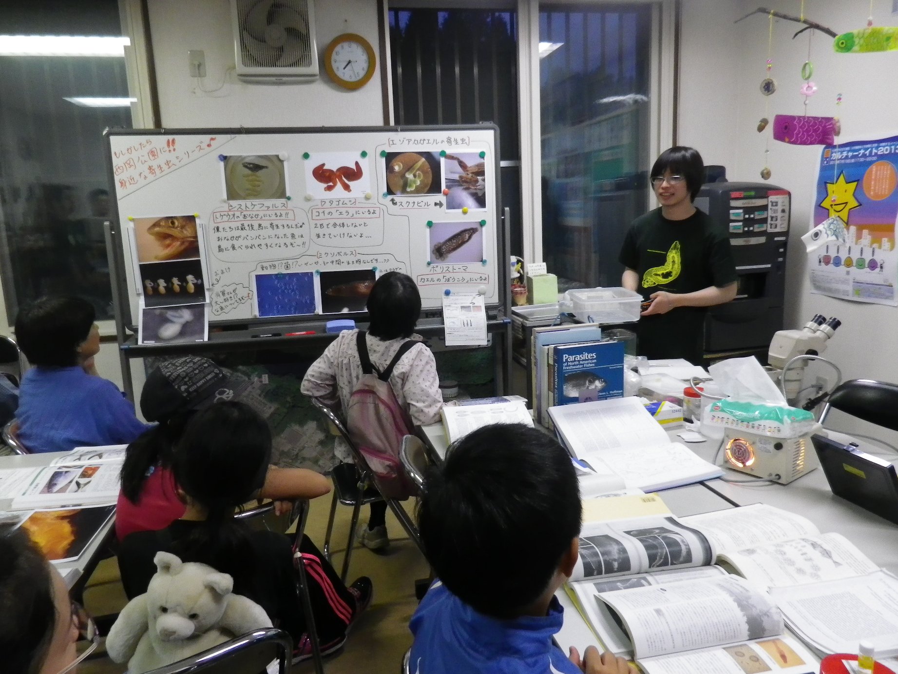 講習室は、寄生虫の専門家片平浩孝さん(北海道大学地球環境科学研究院博士研究員)の