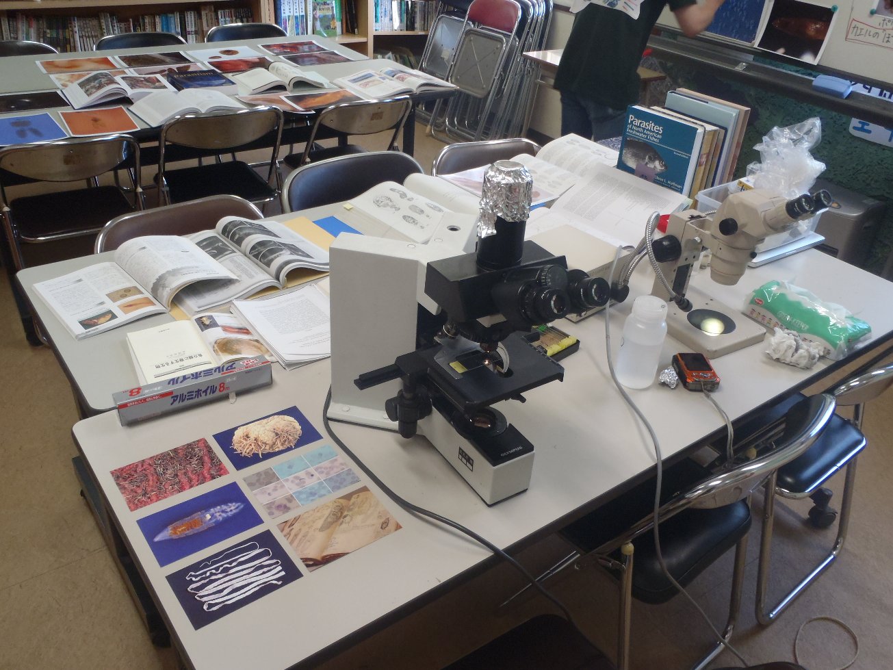 ディープなお部屋です。夕方から顕微鏡や寄生虫の写真が持ち込まれて、あっという間に寄生虫ワールドになりました。
