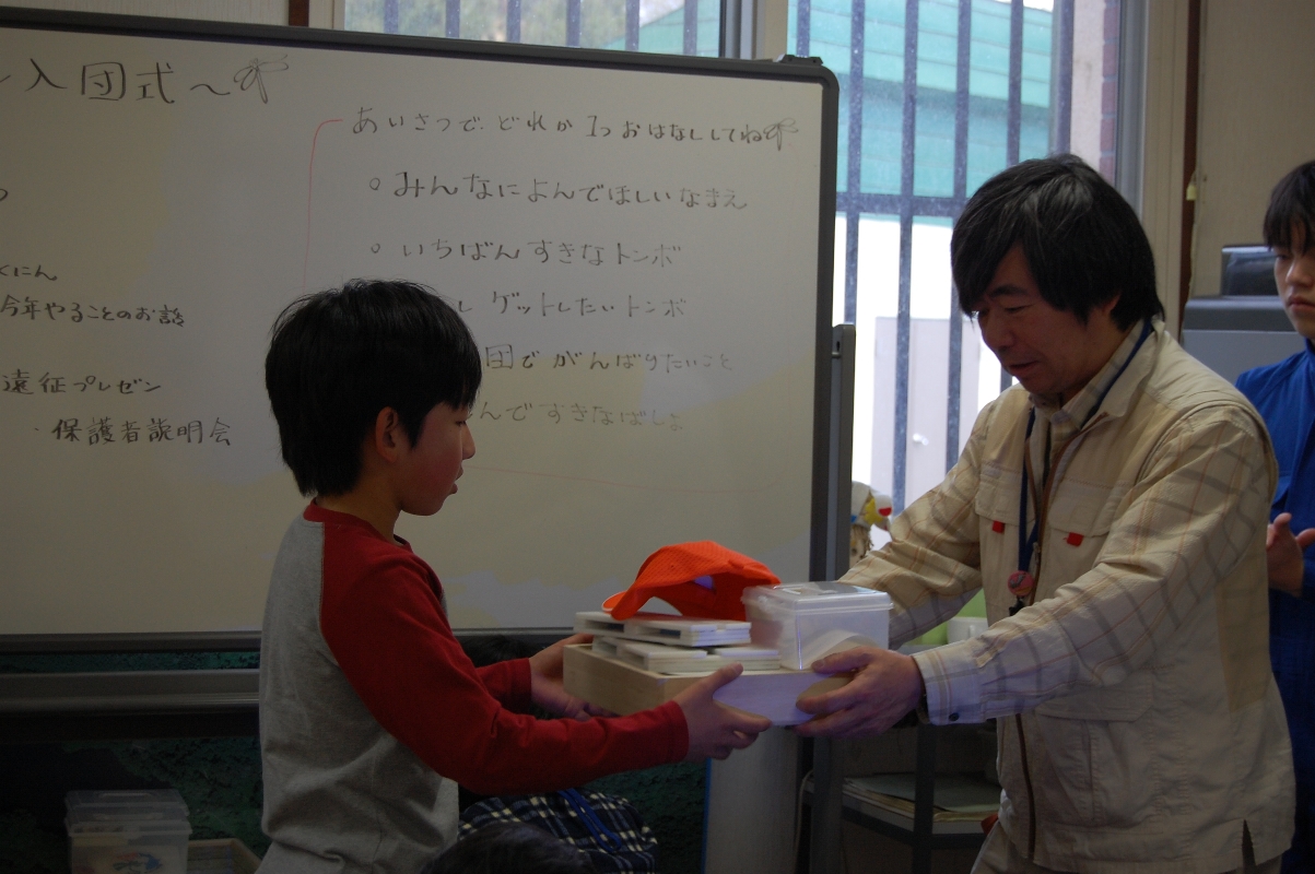 自己紹介の後、トンボのおじさんから、一人一人に団員グッズや標本箱