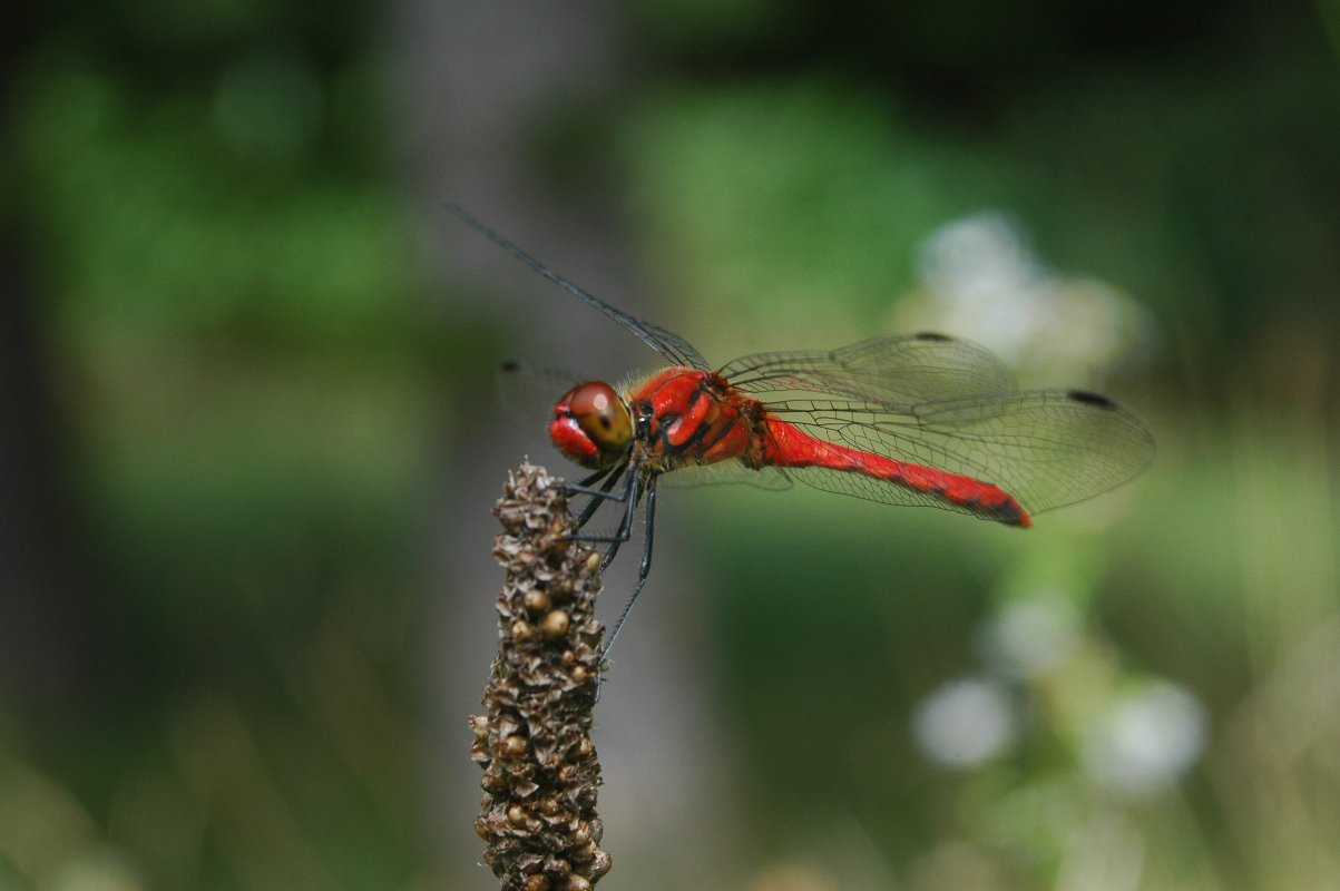 赤トンボがたくさん飛ぶ季節になりましたね。 赤トンボと一言で言っても、西岡公園には約十種類も赤トンボの仲間がいます。 写真のトンボは、西岡公園ではそれほど多くない赤トンボ、「ナツアカネ」です。 ナツアカネは、成熟するとどこへ行くのか、ほとんど見かけなくなりますが、 トンボのおじさん情報では、今年は成熟して顔まで真っ赤に色づいたナツアカネが、 時々見つかっているそうです。