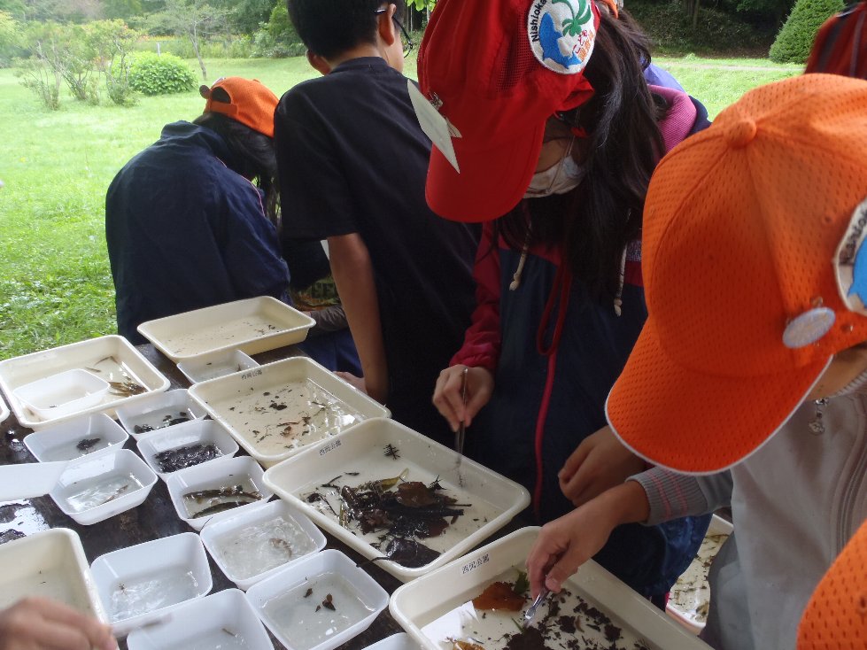 採集調査を終え、そのまま近くの広場に移動し、次は種類分けと計測を行います。