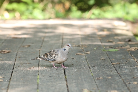 木道で何かをついばむキジバト。