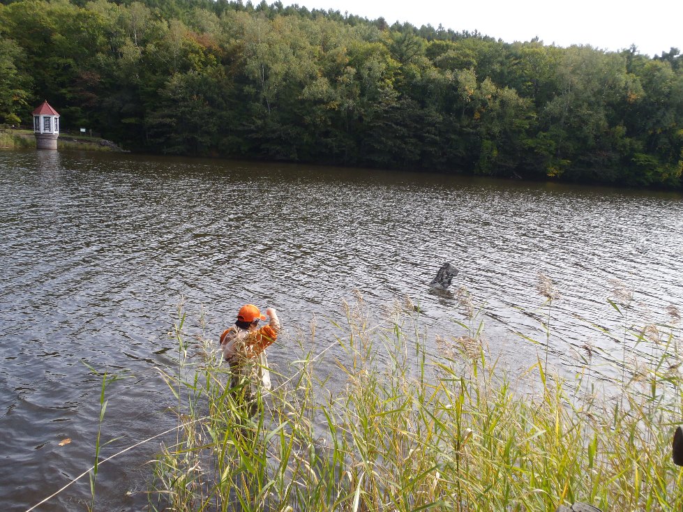水源池は取水塔の辺りは深いが柵沿いは思いのほか浅く、木道側では遠浅になっているおかげで広範囲にわたって調査ができました。