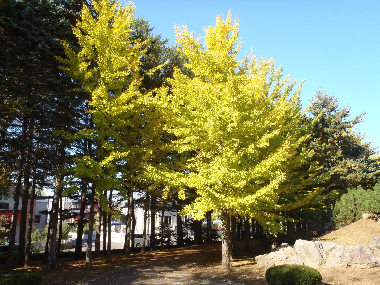 管理事務所前のイチョウ並木は、秋が深まる頃には、毎年黄金色に色づきます。