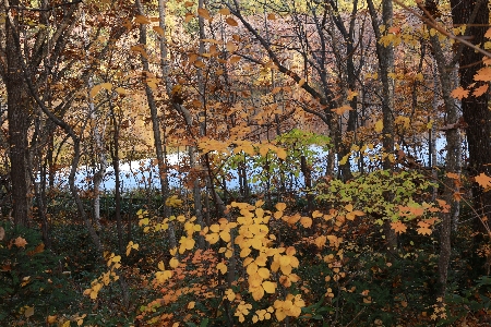 木々の向こうに池がはっきりと見えるようになりました。