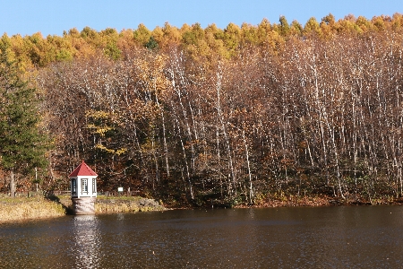 取水塔の向こう、尾根のカラマツが黄色く色づき始めました。