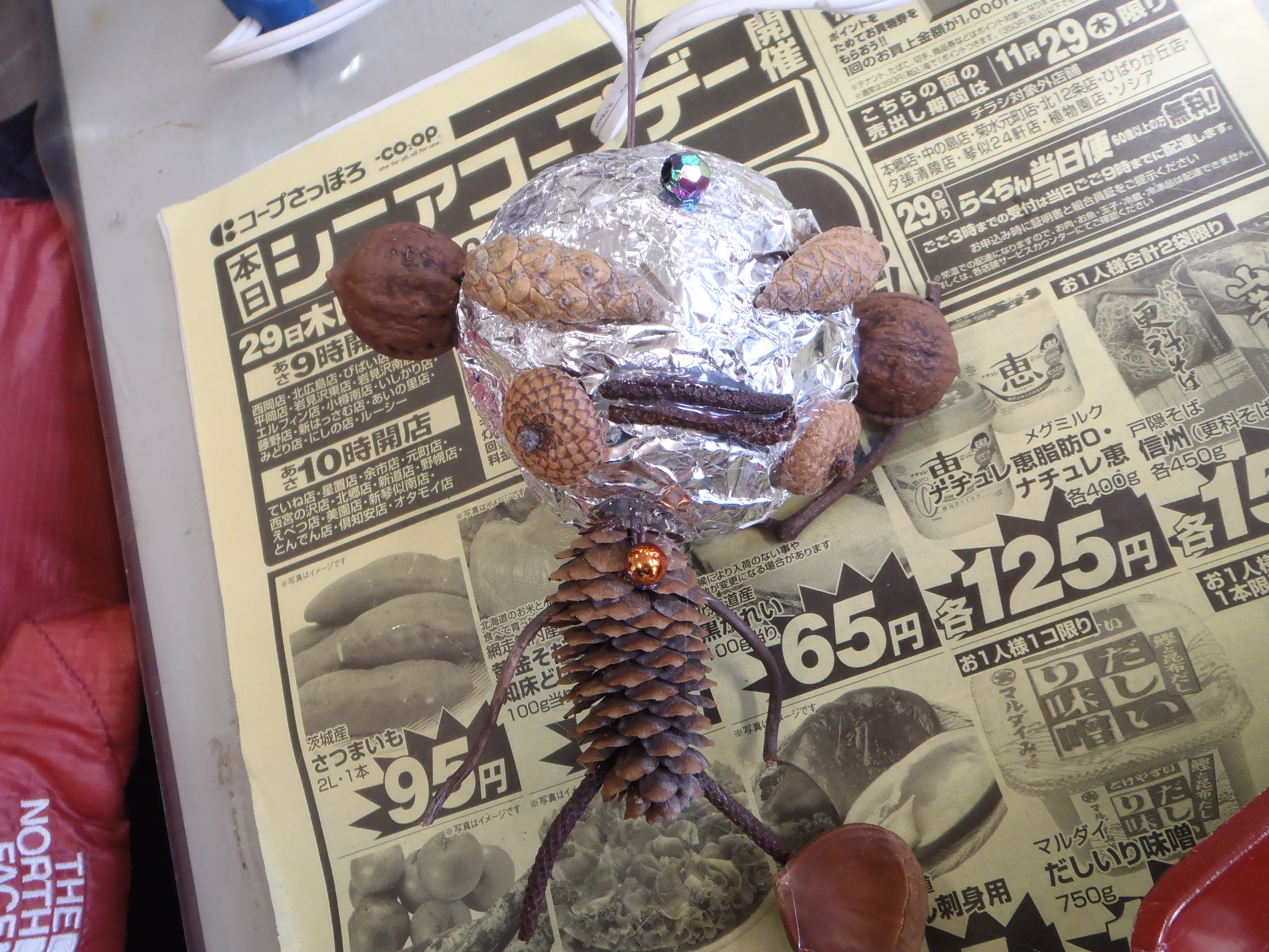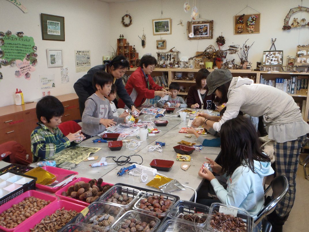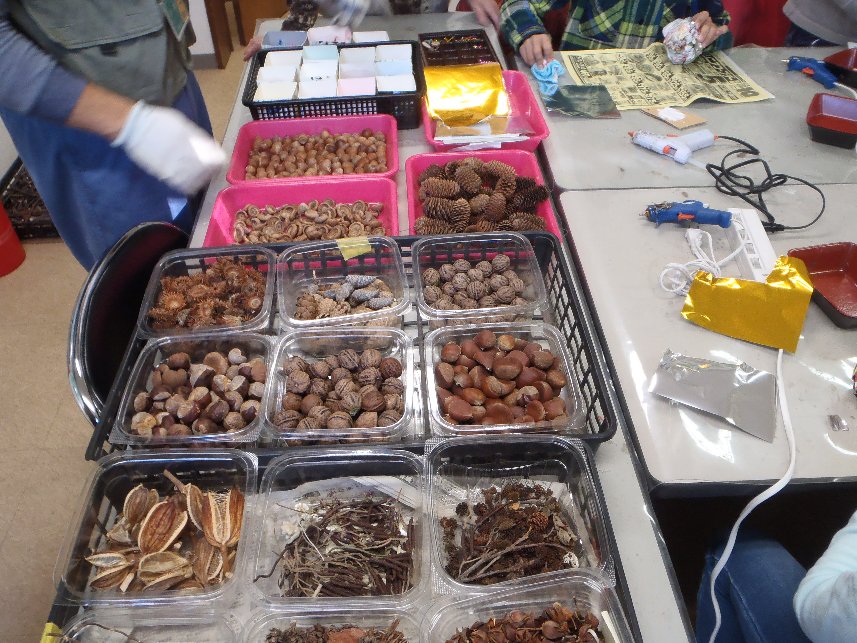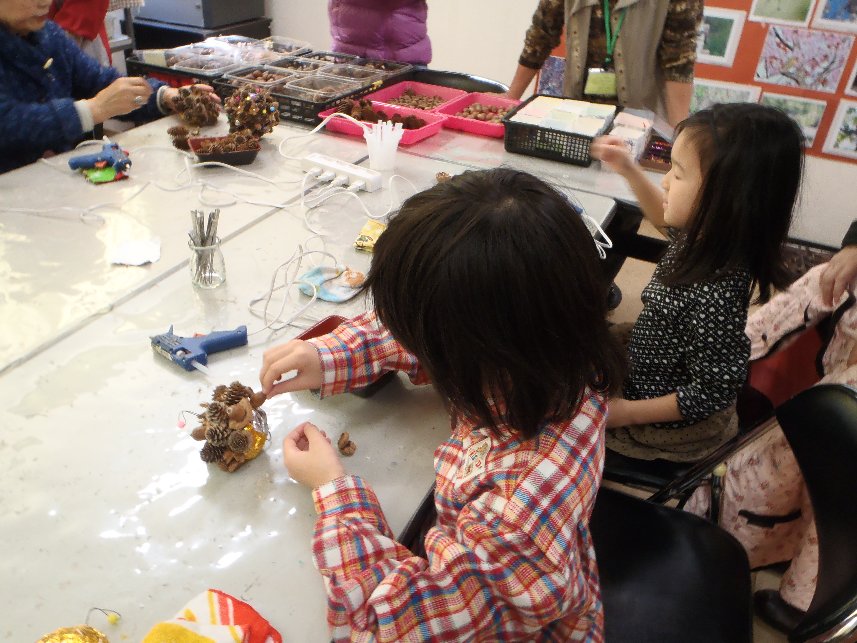 西岡公園で集めた松ぼっくりやどんぐりを使い、リボンやビーズで綺麗に飾り付け☆