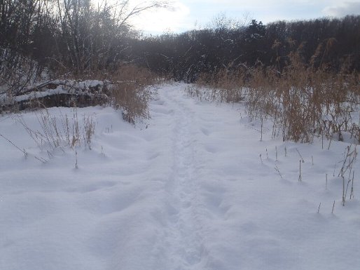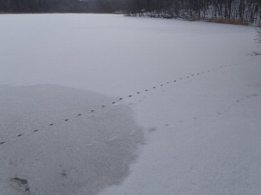 雪だるまを見た後、水源池の方へ移動すると、池の上にはキツネのものと思われる一直線に伸びる足跡を見つけました。