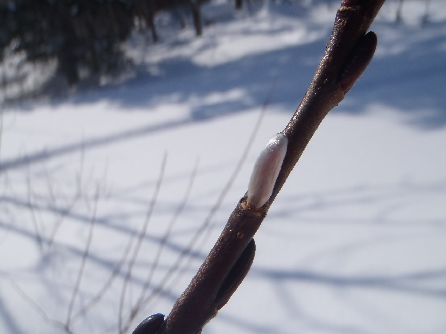 そんな木道を歩いていると、ヤナギの冬芽が剥けて、ほわほわの白い芽が 顔を出していました。